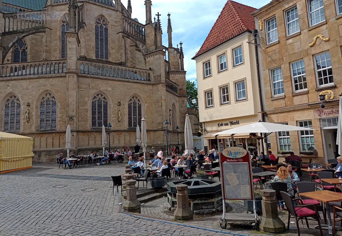 Menschen am Osnabrücker Marktplatz. / Foto: Brockfeld