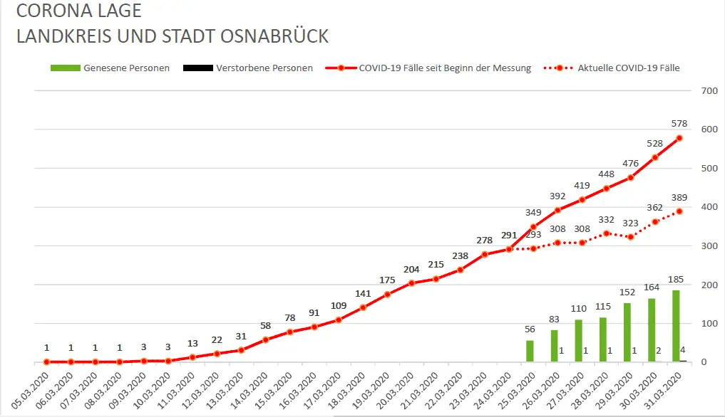 Die Neuinfektionen am Dienstagmittag wurden überwiegend im Landkreis Osnabrück verzeichnet. Hier sind in einem Zeitraum von etwa sechs Stunden 19 weitere Infektionen mit dem Coronavirus dokumentiert worden. Im Umkehrschluss wurden lediglich sechs Neuinfizierte in der Stadt Osnabrück gemeldet.