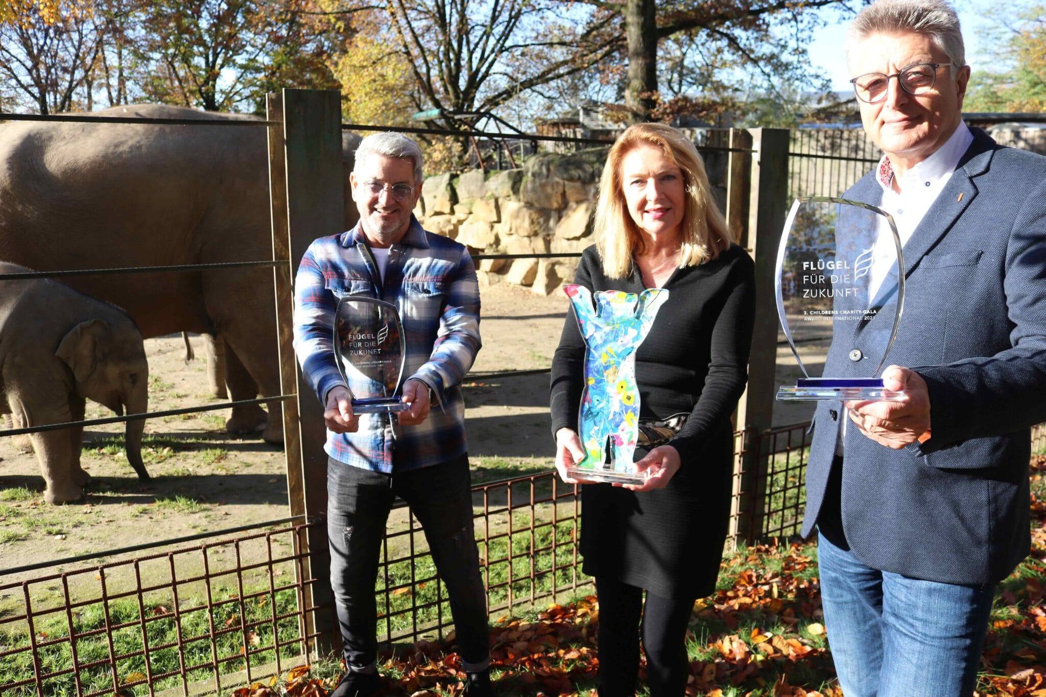 Die 3. Children’s Charity Gala „Flügel für die Zukunft“ findet am Samstag um 18 Uhr im Alando Ballhaus statt. John McGurk (Sponsoring und Charity, Zoo Osnabrück), Heike Busemann (Marketing, Zoo Osnabrück) und Dr. E.h. Fritz Brickwedde (Präsident der Zoogesellschaft Osnabrück e.V.; v.l.n.r.) präsentieren einen der 2D-Buddy Bären für die Versteigerung und zwei der Awards der Gala. /Foto: Zoo Osnabrück (Lisa Simon)