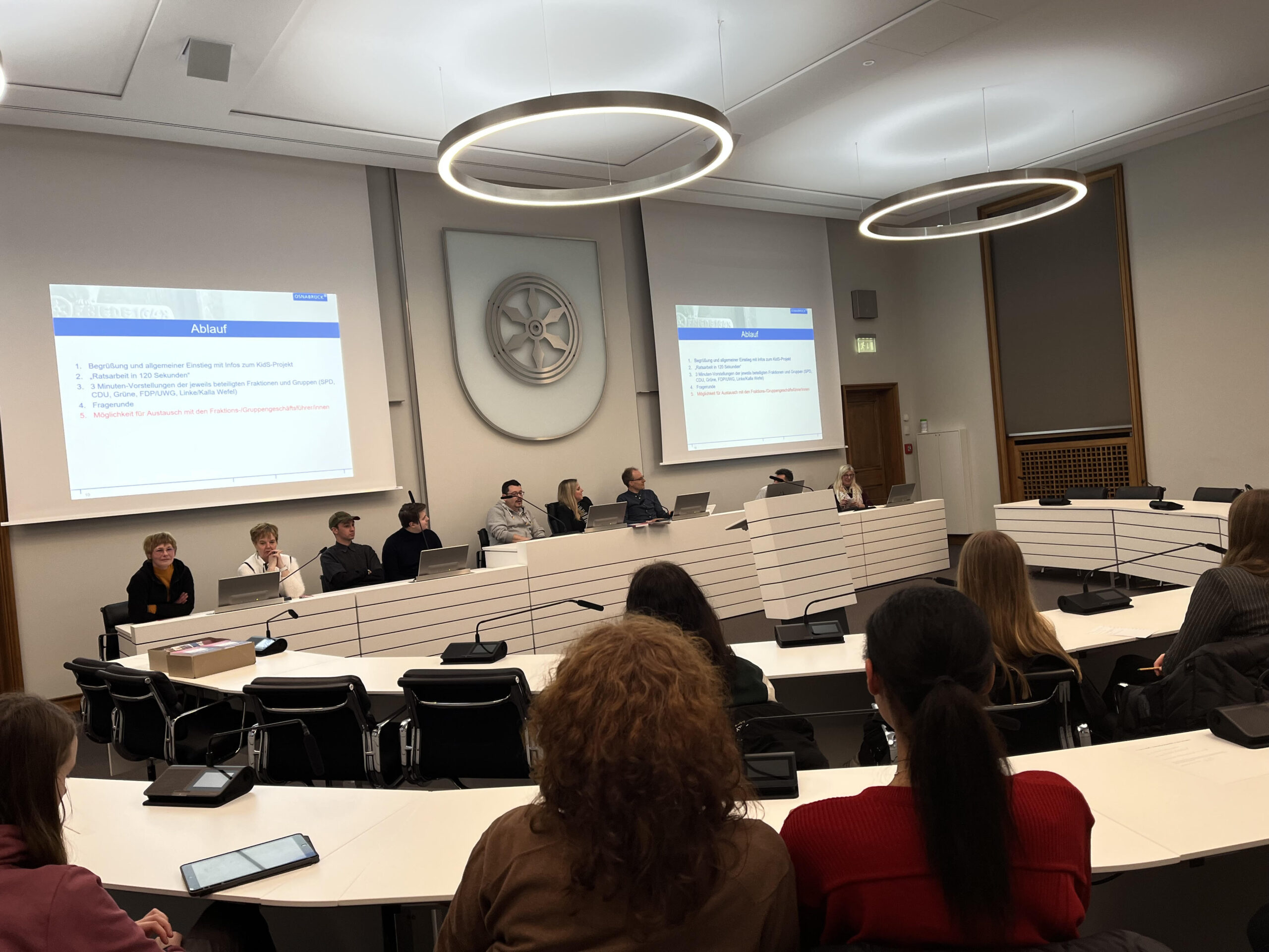 Bei dem seit 2001 stattfindende Projekt können die Schülerinnen und Schüler aus der Jahrgangsstufe neun und zehn den ehrenamtlichen Ratsmitgliedern über die Schulter schauen. Vom 26. April bis 31. Mai findet das KidS (Kommunalpolitik in den Schulen) statt. Ziel ist es, das Interesse an Kommunalpolitik bei Kindern und Jugendlichen zu wecken oder zu vertiefen. Bei der vorherigen Anmeldung können sie in einem Erst- und Zweitwunsch äußern, welche Partei sie für vier Wochen unterstützen möchten.