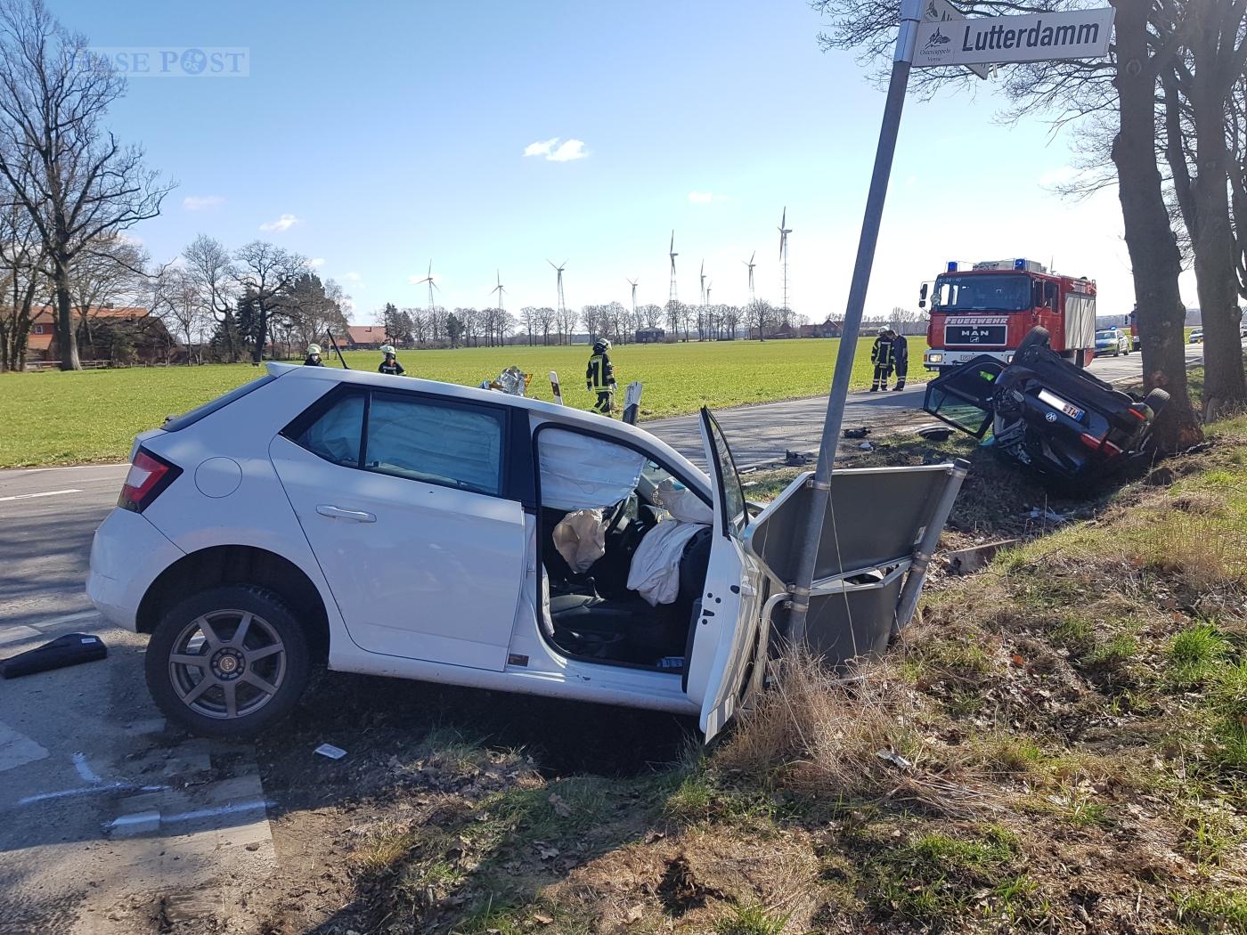 Um 12:15 Uhr wurden zahlreiche Rettungskräfte zur Unfallstelle gerufen. An der Kreuzung der Landstraßen Vördener Straße / Alter Damm und Lutterdamm waren zwei PKW kollidiert. Ein VW Golf war zuvor in Richtung Alter Damm / Ostercappeln-Venne gefahren, als er von einem von links kommenden Skoda Fabia erfasst wurde.