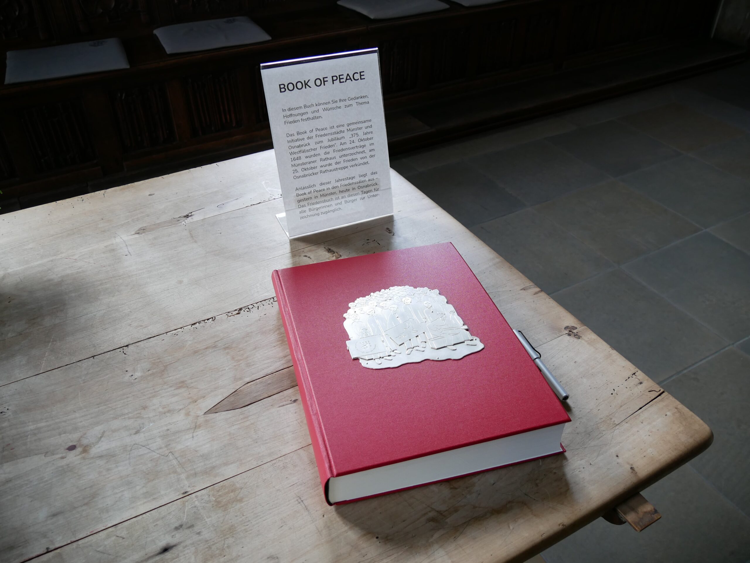 Ihre Gedanken, Hoffnungen und Wünsche zum Thema Frieden können alle Menschen in Münster und Osnabrück festhalten im so genannten „Book of Peace“. Gestern (24.10.) lag das Buch in der Bürgerhalle des Rathauses in Münster aus. Heute (25.10.) wurde es von Münsters Bürgermeisterin Maria Winkel, die Oberbürgermeister Markus Lewe vertrat, nach Osnabrück gebracht, wo es im Friedenssaal ausliegt. Die in Münster ansässige Juwelierwerkstatt J. C. Osthues hat den silbernen Einband des handgefertigten Buches eigens für den historischen Jahrestag entworfen.