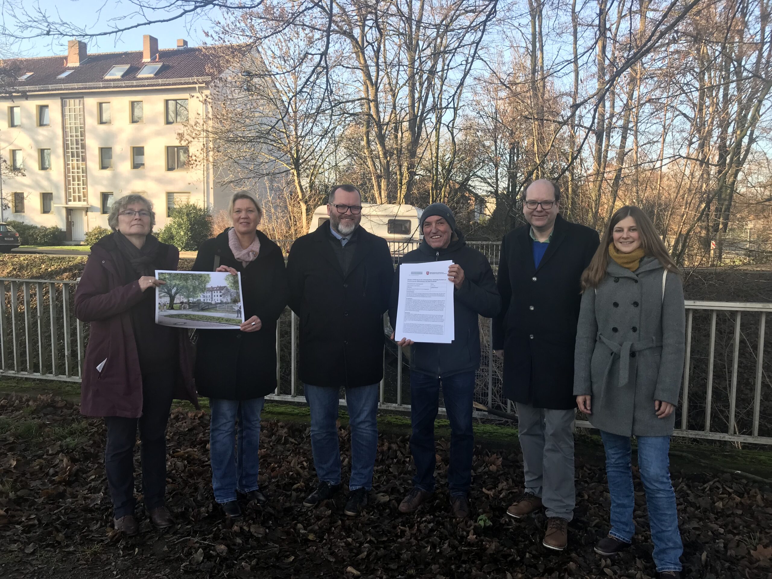 (von links) Claudia Leyers (Stadt Osnabrück), SPD-Fraktionsvorsitzende Susanne Hambürger dos Reis, Mike Bohne (Stadt Osnabrück), Vorsitzender des Wüsteninitiative e.V. Kurt Dombeck, Landesumweltminister Christian Meyer und Landtagsabgeordnete Anne Kura (GRÜNE) an der Stelle, an der die Brücke gebaut werden soll. / Foto: Burrichter