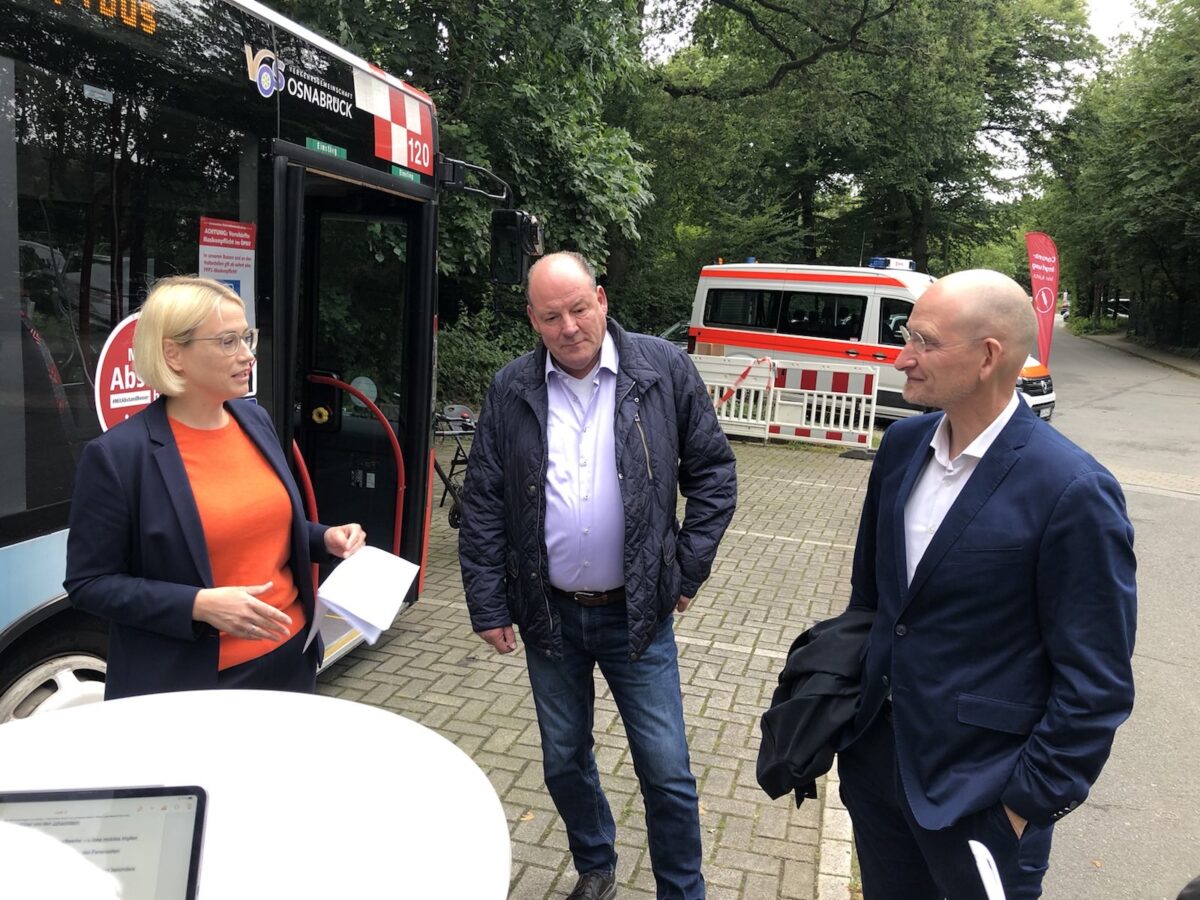 Darüber, dass der Impfbus gut angenommen wird, freuen sich (von links) Stadträtin Katharina Pötter, Kai Müller, Dienststellenleiter der Johanniter-Unfall-Hilfe Osnabrück, und Christoph Hüls, Vorstandsvorsitzender der Stadtwerke Osnabrück. / Foto: Sven Jürgensen