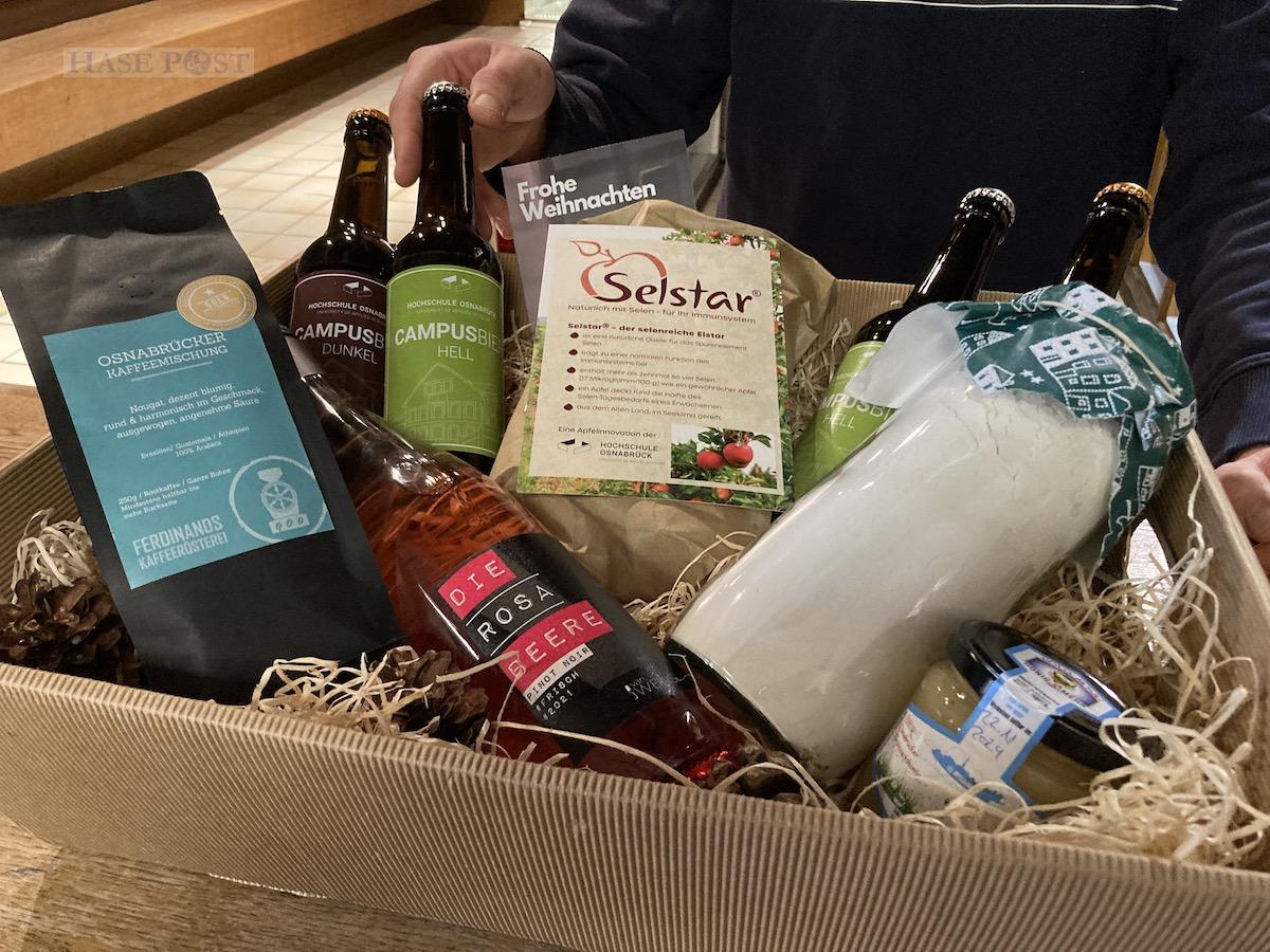 Zum vierten Mal bietet das Campusbier-Team der Hochschule Osnabrück Geschenkboxen mit regionalen Produkten an. In diesem Jahr gibt es neben Honig, Backmischung und Kaffee auch erstmals Osnabrücker Äpfel und Wein. Bis Donnerstag (15. Dezember) können noch Boxen online vorbestellt werden.
