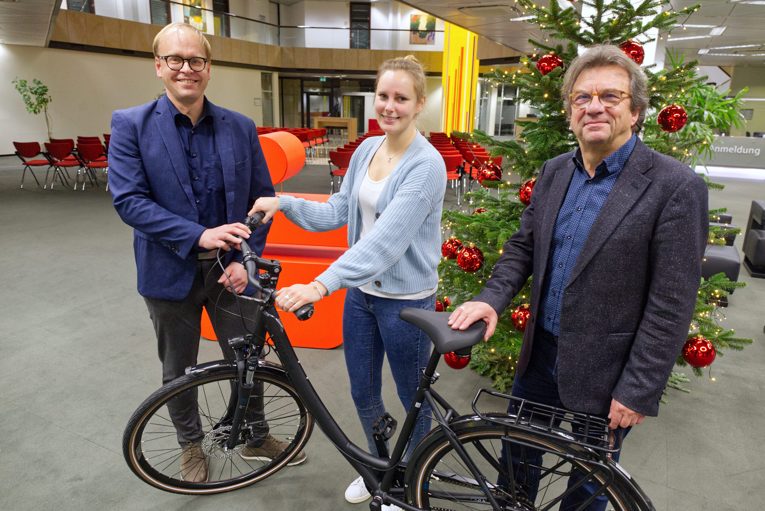 Die glückliche Gewinnerin Tabea Trebesch mit ihrem neuen Fahrrad. Mit ihr freuen sich Ralf Hellige von der Sparkasse Osnabrück (links) und Stadtbaurat Frank Otte. / © Robert Schäfer
