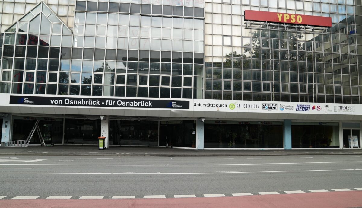 Die Arbeiten am Neumarkt schreiten weiter voran: Nachdem bereits in der vergangenen Woche neue Mülltonnen sowie zahlreiche Pflanzen und Bäume am langjährigen Schandfleck der Stadt aufgestellt wurden, ist nun das ehemalige Wöhrl-Gebäude an der Reihe. Die obere Blende des leerstehenden Komplexes wurde am Freitag (15. Juli) mit einem großen „Von Osnabrück – Für Osnabrück“-Banner sowie Flächen mit den Kooperationspartnern der privaten Reinigungsarbeiten beklebt. Am kommenden Montag sollen dann auch die Säulen zwischen den Fenstern zu Werbeflächen werden. Aktuell kleben dort noch etliche Sticker, die sich über die Jahre angesammelt haben. „Die Säulen werden überklebt und foliert“, erläutert Stefan Waigel, Geschäftsführer der Snicemedia GmbH, die die Folierungen vornimmt.