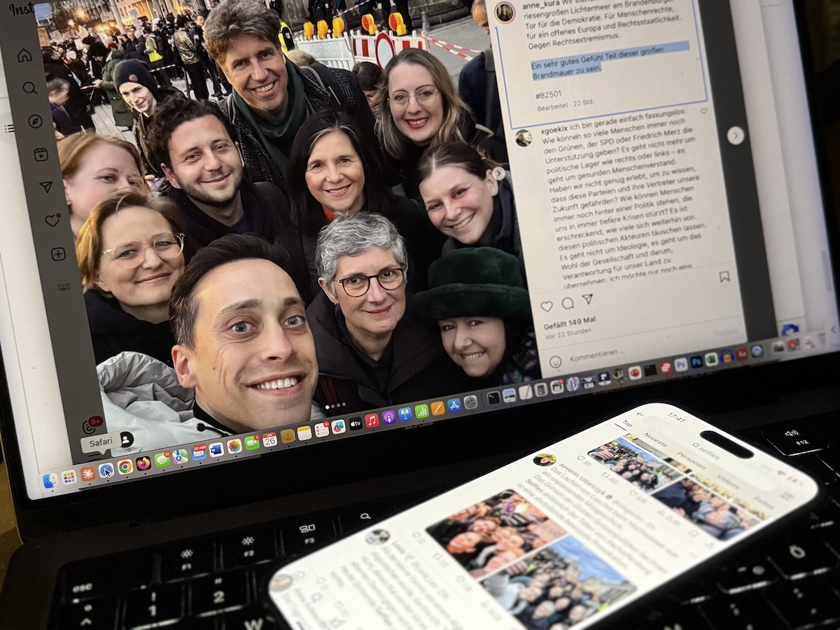 Die Selfies, die in verschiedenen Varianten insbesondere bei „X“ kursieren, entstanden am Samstag auf einer Demonstration gegen die Migrationspläne von CDU und CSU, zu der unter anderem die Organisation Campact aufgerufen hatte. Auf einigen Selfies ist neben der Parteiprominenz der Grünen auch die Klima-Influencerin Luisa Neubauer zu sehen.