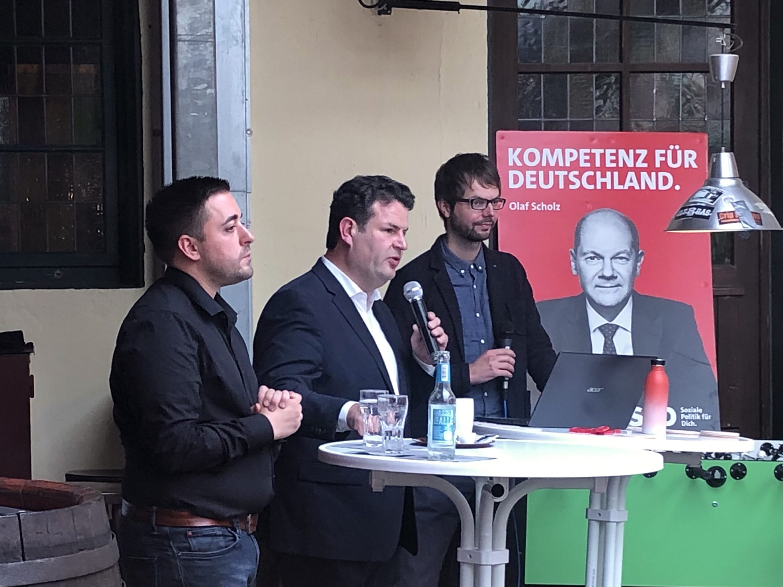 Im Rahmen des SPD-Diskussionsformates „Auf ein Wort“ trafen sich am heutigen Dienstag (21. September 2021) der SPD-Bundestagskandidat Manuel Gava und der Bundesminister für Arbeit und Soziales Hubertus Heil auf ein Gespräch im Grünen Jäger. Auch die Kreisvorsitzende des Deutschen Gewerkschaftsverbundes (DGB) Nicole Verlage kam während der Diskussion zu Wort.