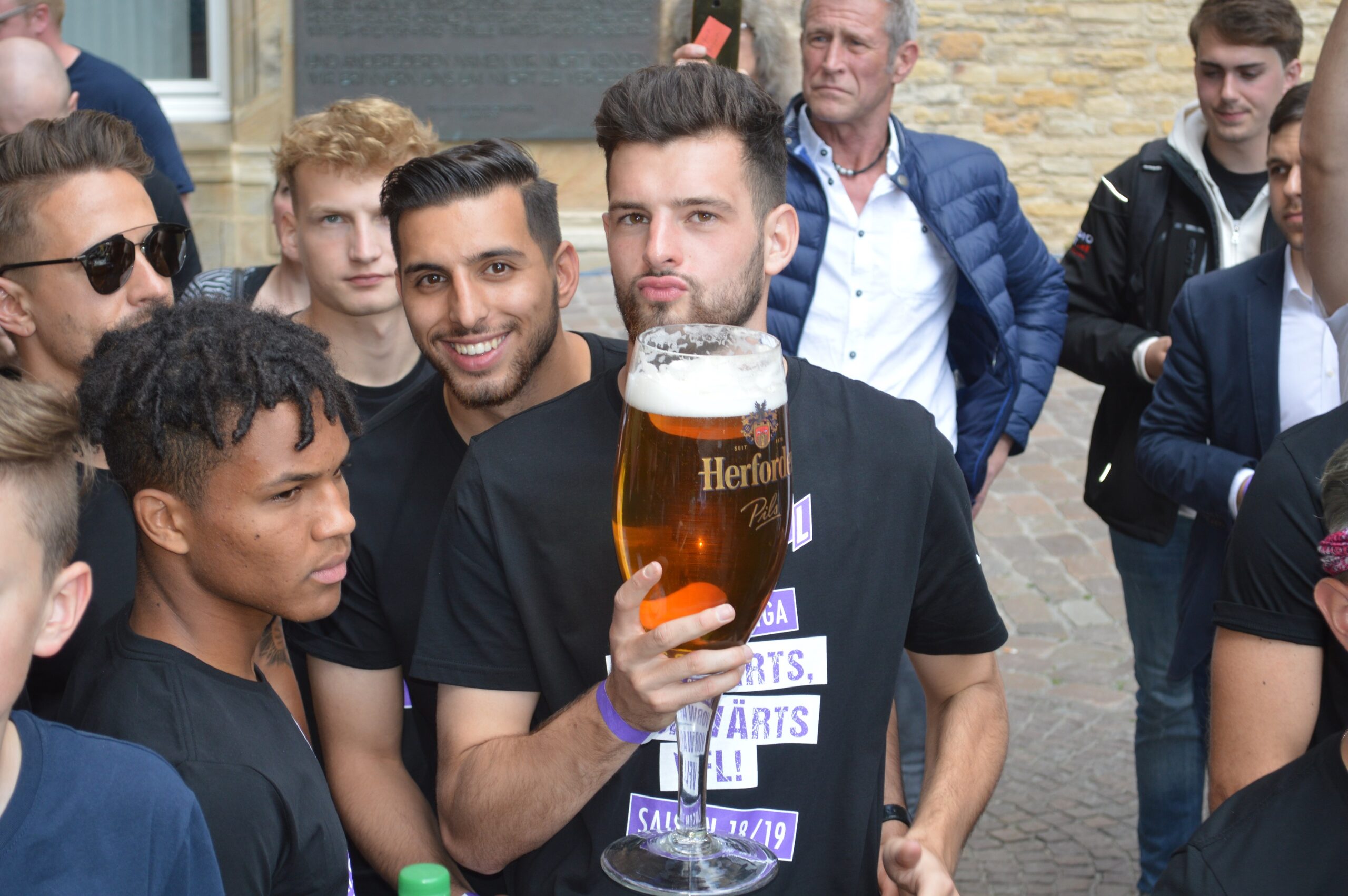 Um halb zwei präsentierte die Mannschaft sich dann gemeinsam mit ihrem Team den Fans auf dem Rathausplatz. Die waren zuvor schon von Musiker Christian Steiffen gehörig angeheizt worden. Torhüter Nils Körber lässt dann nochmal eine Bombe platzen: „Wir sehen uns dann im nächsten Jahr noch ein bisschen öfter.“ Richtig gehört, Körbers Leihe geht für ein weiteres Jahr in die Verlängerung, was postwendend von Mannschaftskollegen und Fans mit einem begeisterten „Körber bleibt bei uns“-Gesang quittiert wird. Der Torhüter richtet noch ein „großes Danke“ an die Fans, bevor die Hymne „Wir sind alle ein Stück VfL Osnabrück“ angestimmt wird. Nachdem Christian Steiffen dann nochmals mit seinem Song „Disco, Disco“ erneut die Bühne stürmt und für Stimmung sorgt, erfolgt unter Jubelrufen eine tänzerische Darstellung von Zeugwart Mario Richter zu Rio Reisers „König von Deutschland“.