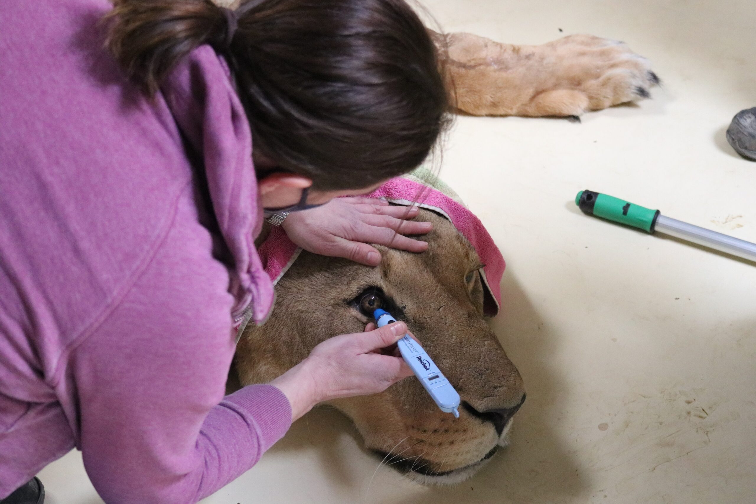 Tierärztin Dr. Antje Nägele untersucht den Augendruck von Löwe Amani. Die narkotisierte Großkatze hat von der Untersuchung nichts gespürt. / Foto: Zoo Osnabrück (Lisa Simon)
