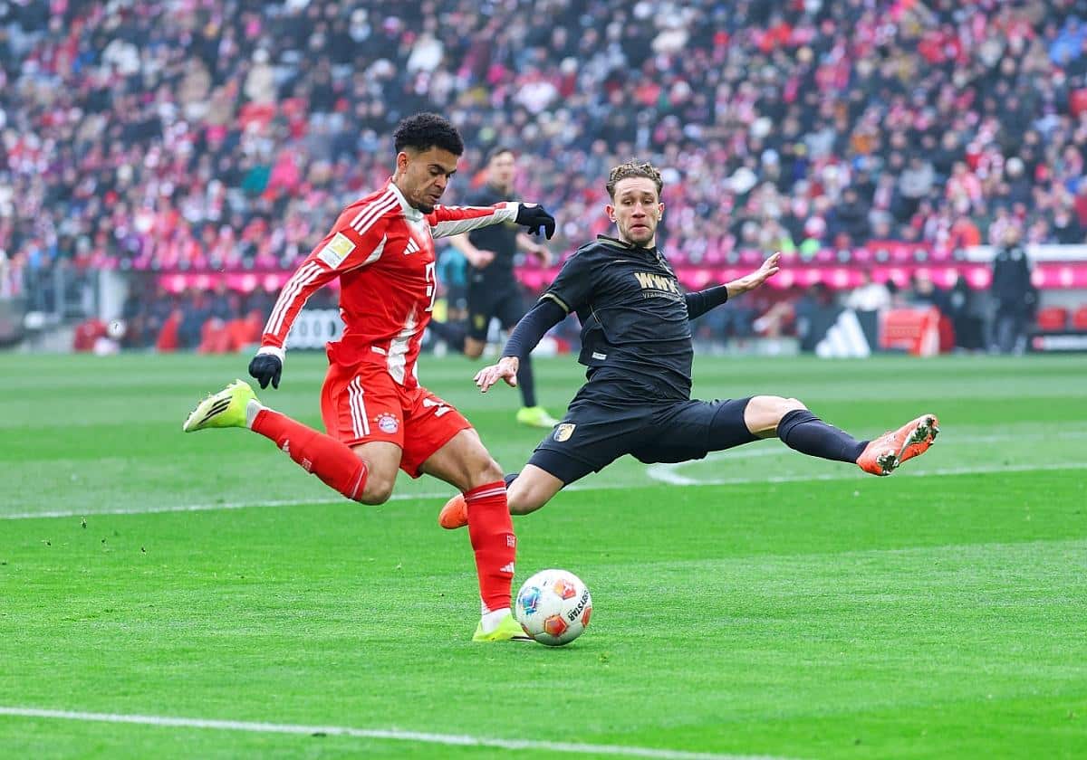 Zu Beginn der Partie dominierten die Bayern wie erwartet den Ballbesitz, fanden aber in den ersten Minuten kaum Wege in die gefährlichen Räume vor dem Tor der Gäste. Augsburg setzte auf eine kompakte Defensive und versuchte, das Aufbauspiel der Münchner früh zu stören, ohne selbst zu zwingenden Chancen zu kommen. Der erste Abschluss gehörte dennoch den Gästen, als Claude-Maurice aus rund 21 Metern knapp am Tor vorbeischoss (5. Minute). Auf Seiten der Bayern sorgte Diaz für die erste gefährliche Aktion, sein Schuss aus spitzem Winkel wurde jedoch von Zesiger geblockt (8.).