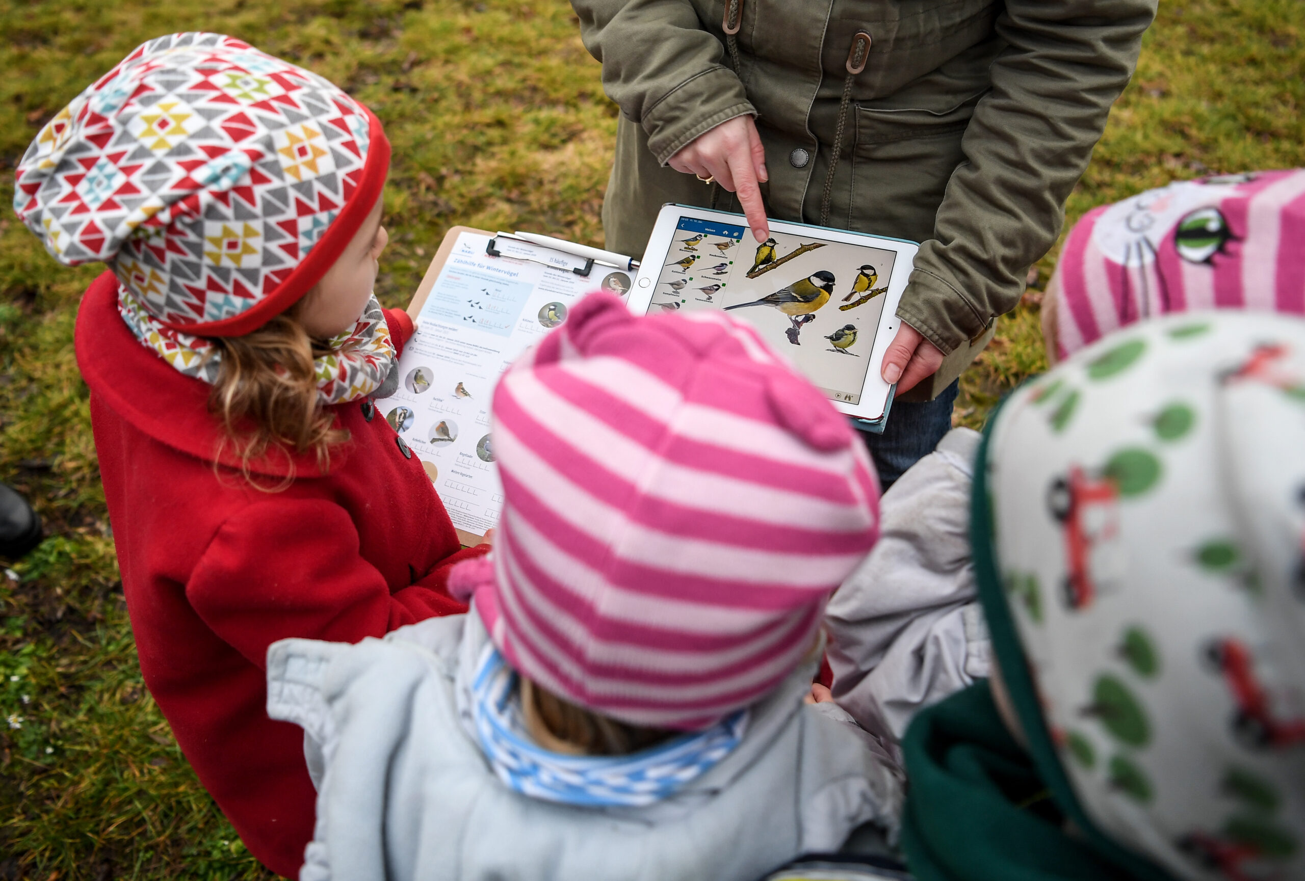 Kinder bestimmen bei der Vogelzählung „Stunde der Wintervögel“ des Nabu (Naturschutzbund Deutschland) mit Hilfe der App „Nabu Vogelwelt“ die Arten. Bei der Mitmachaktion sollen eine Stunde lang alle Vögel, die sich zum Beispiel an einem Futterhäuschen oder in einem Park aufhalten, in Zahl und Art erfasst werden. /Foto: picture alliance/dpa/dpa-Zentralbild (Britta Pedersen)