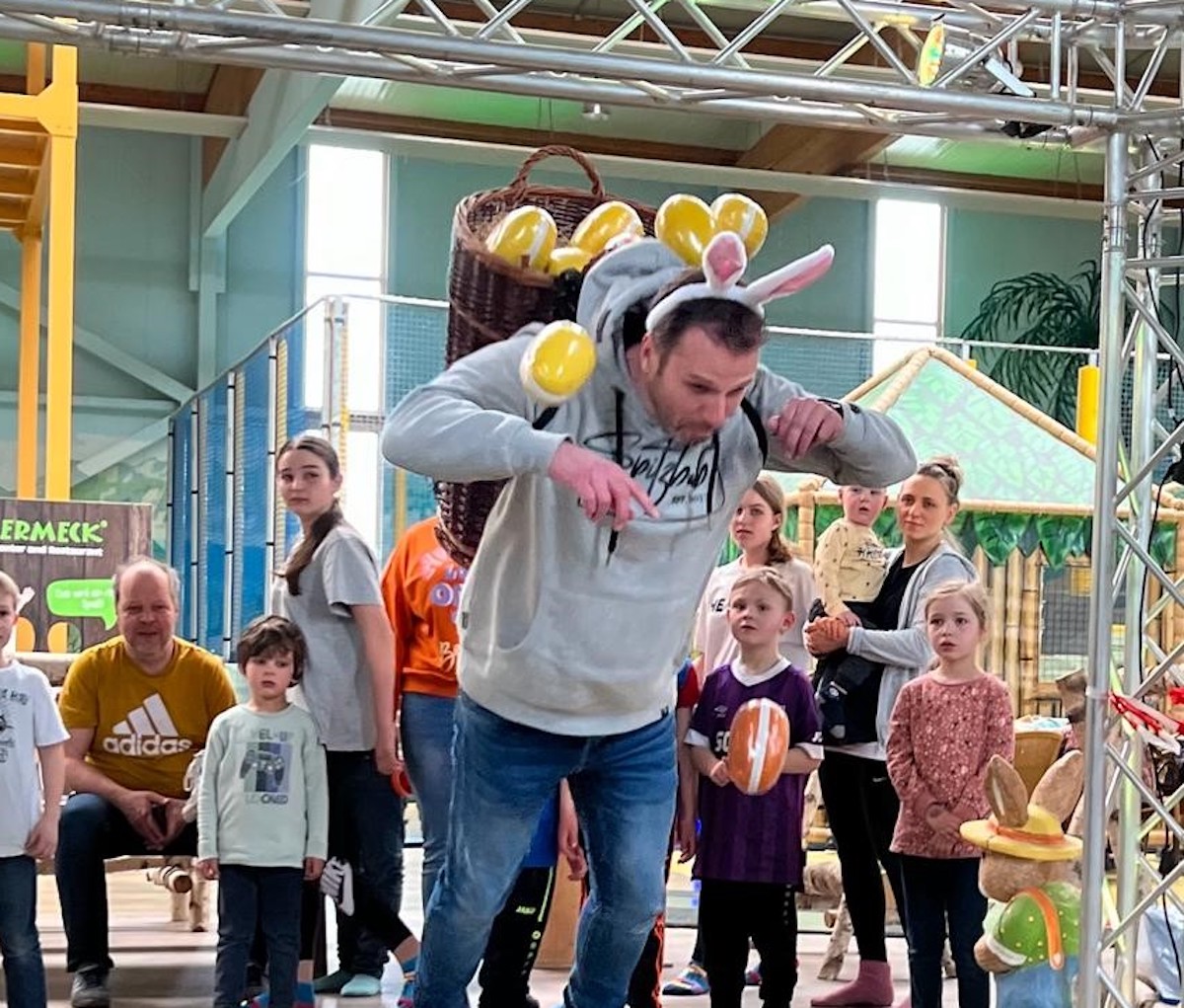 Es galt aus der Hocke springend, mit einer Kiepe und Osterhasenohren versehen, den möglichst weitesten Sprung zu zeigen. Gar nicht so einfach, denn in dem Korb befanden sich Ostereier und pro herausfallendem Ei wurden 10 cm der Sprungweite abgezogen.
