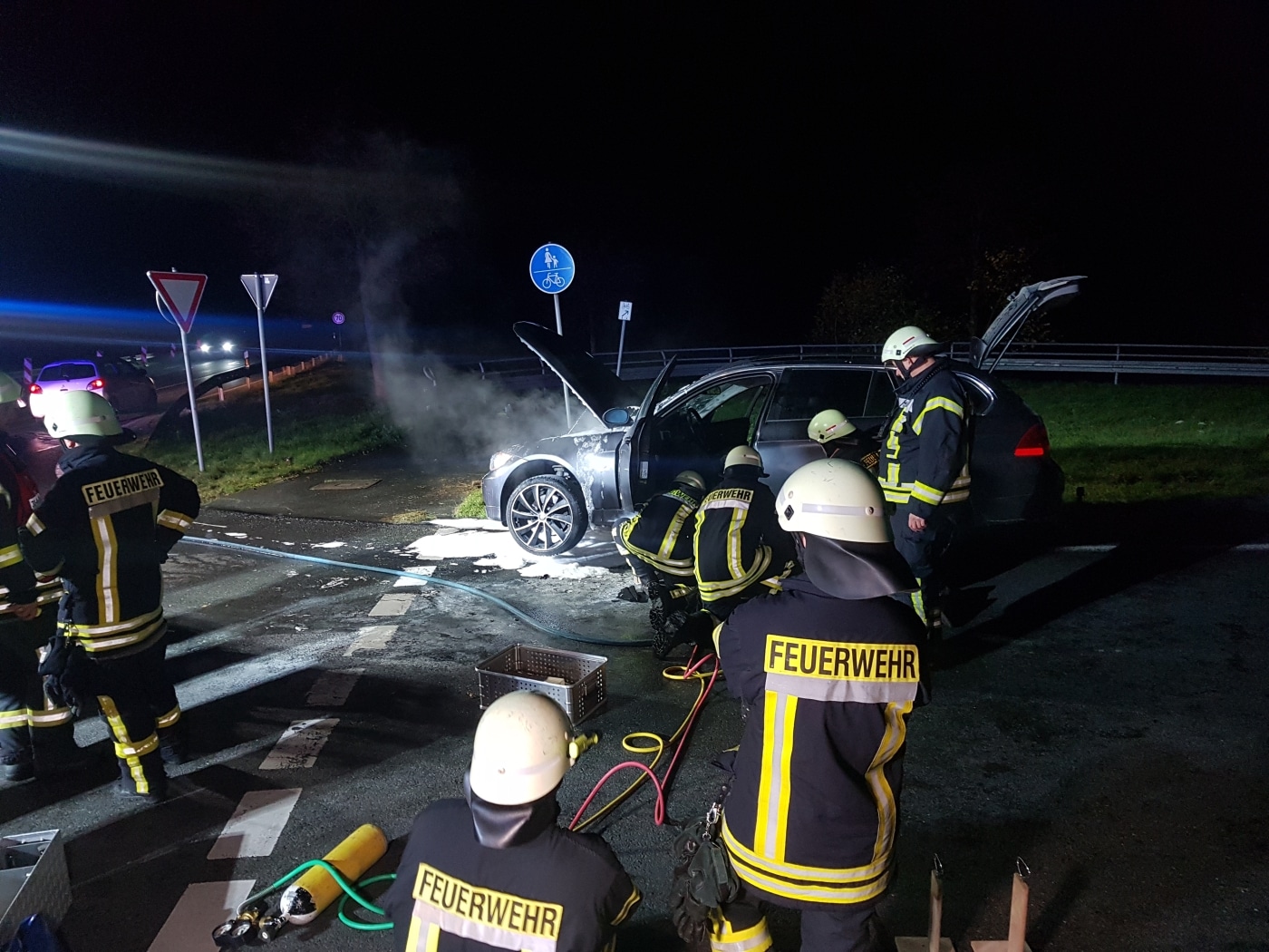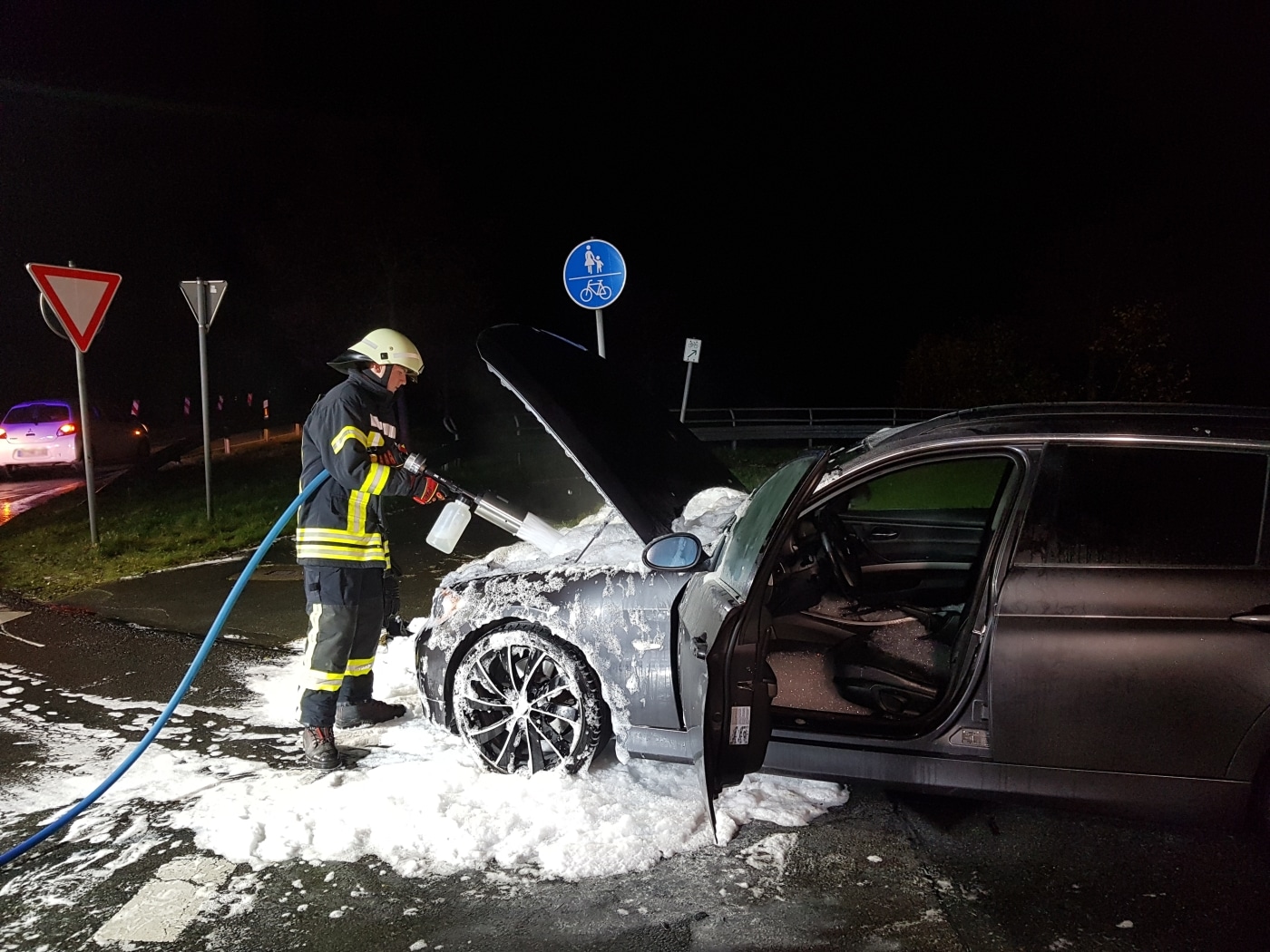 Der Fahrer fuhr noch die Ausfahrt entlang und konnte den Wagen dort sicher stoppen. Gerade noch rechtzeitig konnten er und der Beifahrer den PKW verlassen, als bereits Flammen aus dem Motorraum und über die Windschutzscheibe schlugen.