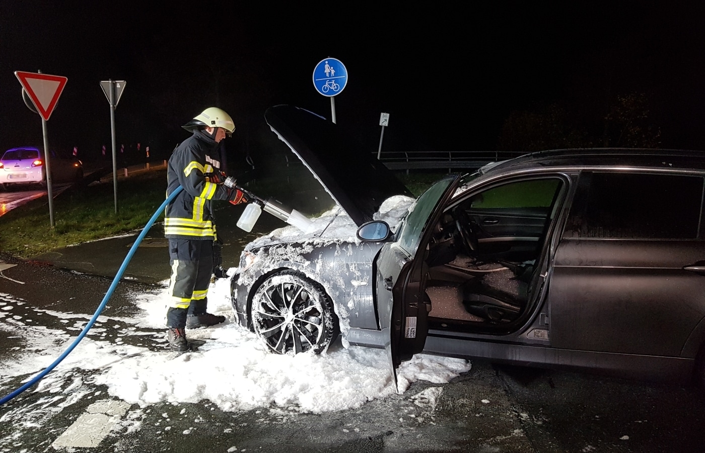 Der Fahrer eines weiteren Autos und ein Lastwagenfahrer kamen nacheinander mit Feuerlöschern zur Hilfe, bis die Feuerwehr eintraf. Zwar konnten die Ersthelfer das Feuer nicht löschen, aber es gelang ihnen einen Vollbrand des gesamten PKW zu verhindern.