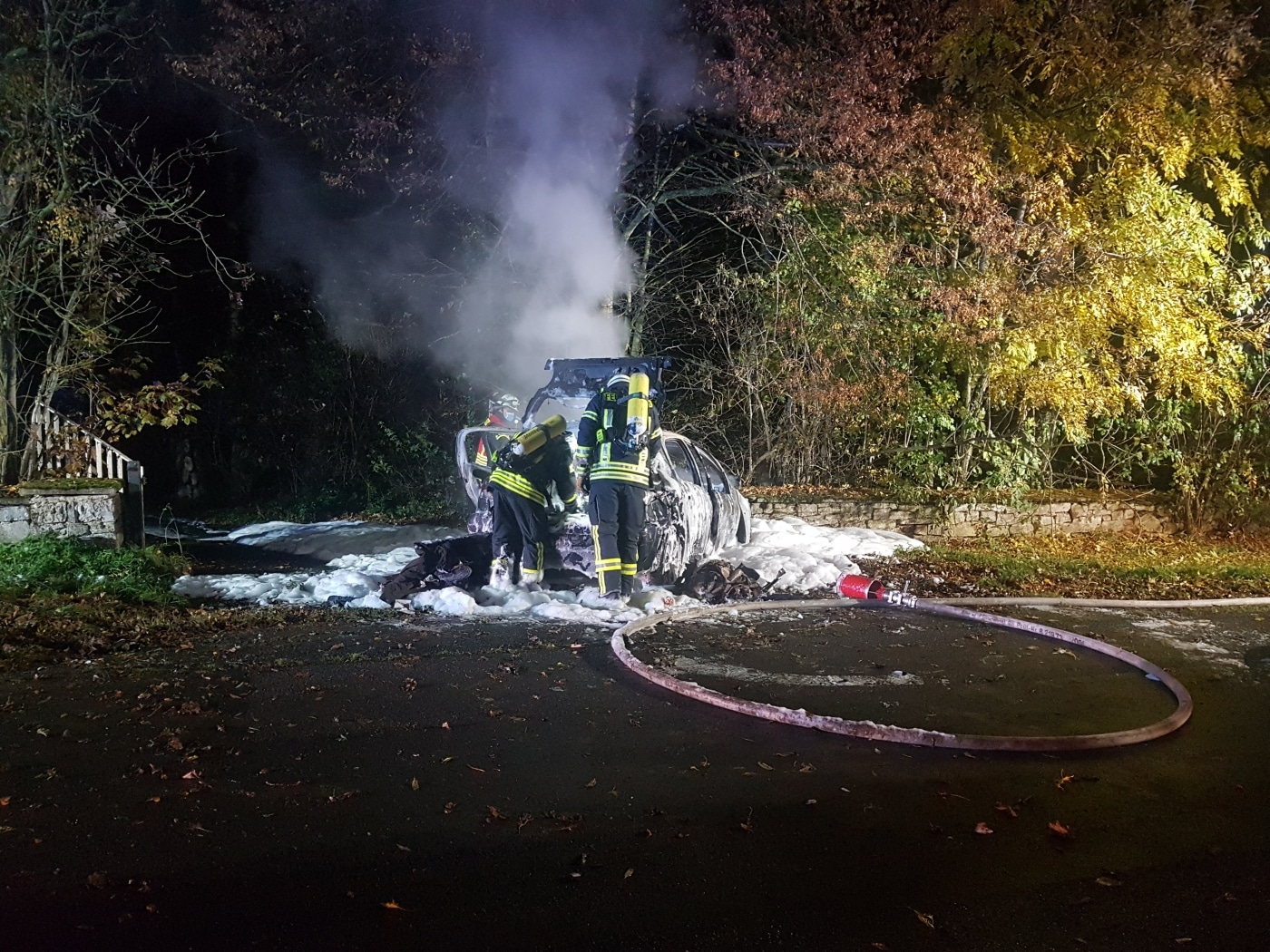 Als die alarmierte Ortsfeuerwehr Buer eintraf, stand der Wagen bereits in Vollbrand. Die 18 Brandbekämpfer brachten die Flammen zunächst mit Wasser unter Kontrolle und löschten den Wagen anschließend mit Schaum ab. Ein Einsatztrupp wurde mit schwerem Atemschutz eingesetzt.