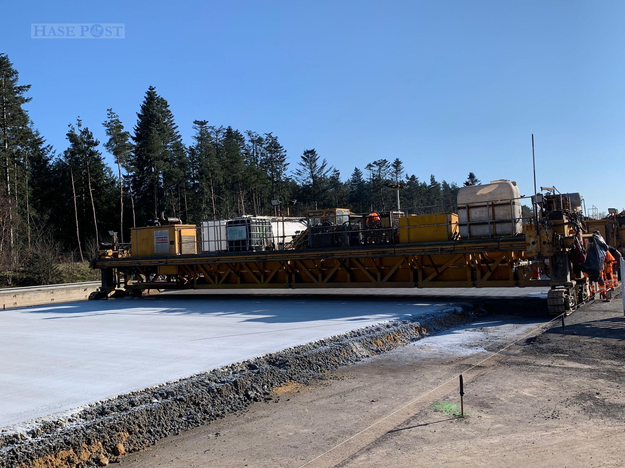 Insgesamt 25 Sattelzüge beliefern den Betondeckenfertiger, damit dieser die Betondecke über die volle Breite von 14,5 Metern – das sind alle drei Fahrspuren und der Standstreifen – in einem Zug ohne Stillstand einbauen kann. Der durchschnittliche Baufortschritt beträgt bei optimalen Witterungsverhältnissen zwischen 400 und 450 Meter, sodass täglich knapp ein Kilometer neue Strecke entstehen kann. Gebaut wird in der Regel rund um die Uhr. Da die Temperaturen aktuell jedoch in den Nächten zu niedrig sind, finden die Arbeiten im Bereich der Tank & Rastanlage Dammer Berge West nur tagsüber statt. Bereits im November wurden die ersten sechs Kilometer der neuen Fahrbahn mit einer Betondecke versehen. Im Februar ging es weiter, bevor Regen und Sturm für eine Unterbrechung sorgten.