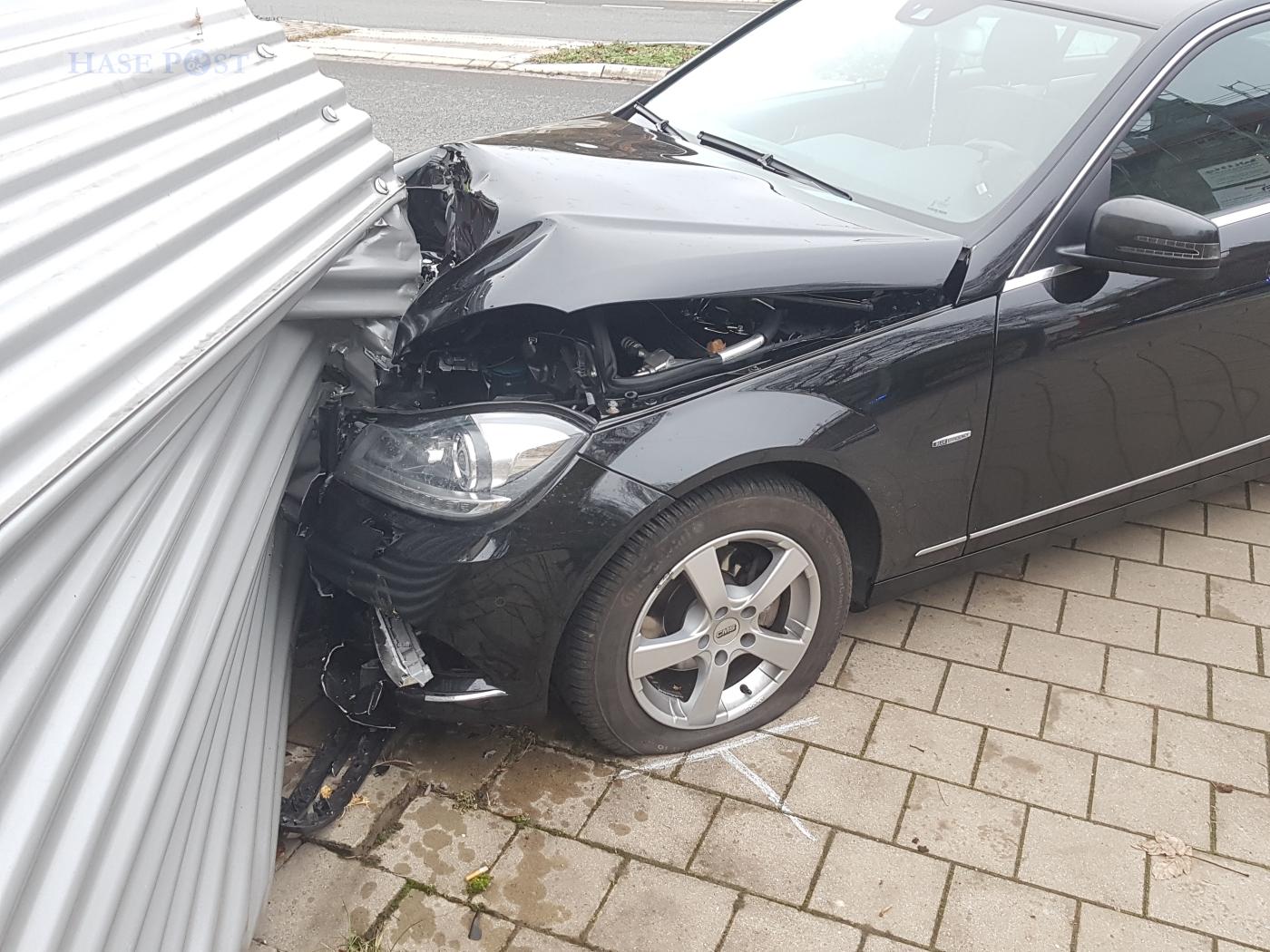 Er fuhr zunächst über eine Verkehrsinsel und erfasste dabei einen kleinen Baum. Danach querte er die Gegenfahrbahn und fuhr auf den gegeüberliegenden Gehweg. Dort prallte das Auto schließlich gegen eine abschließbare Fahrradbox wenige Meter neben einer Bushaltestelle. Die Fahrradgarage wurde dazu noch gegen einen dahinter abgestellten PKW-Anhänger gedrückt.