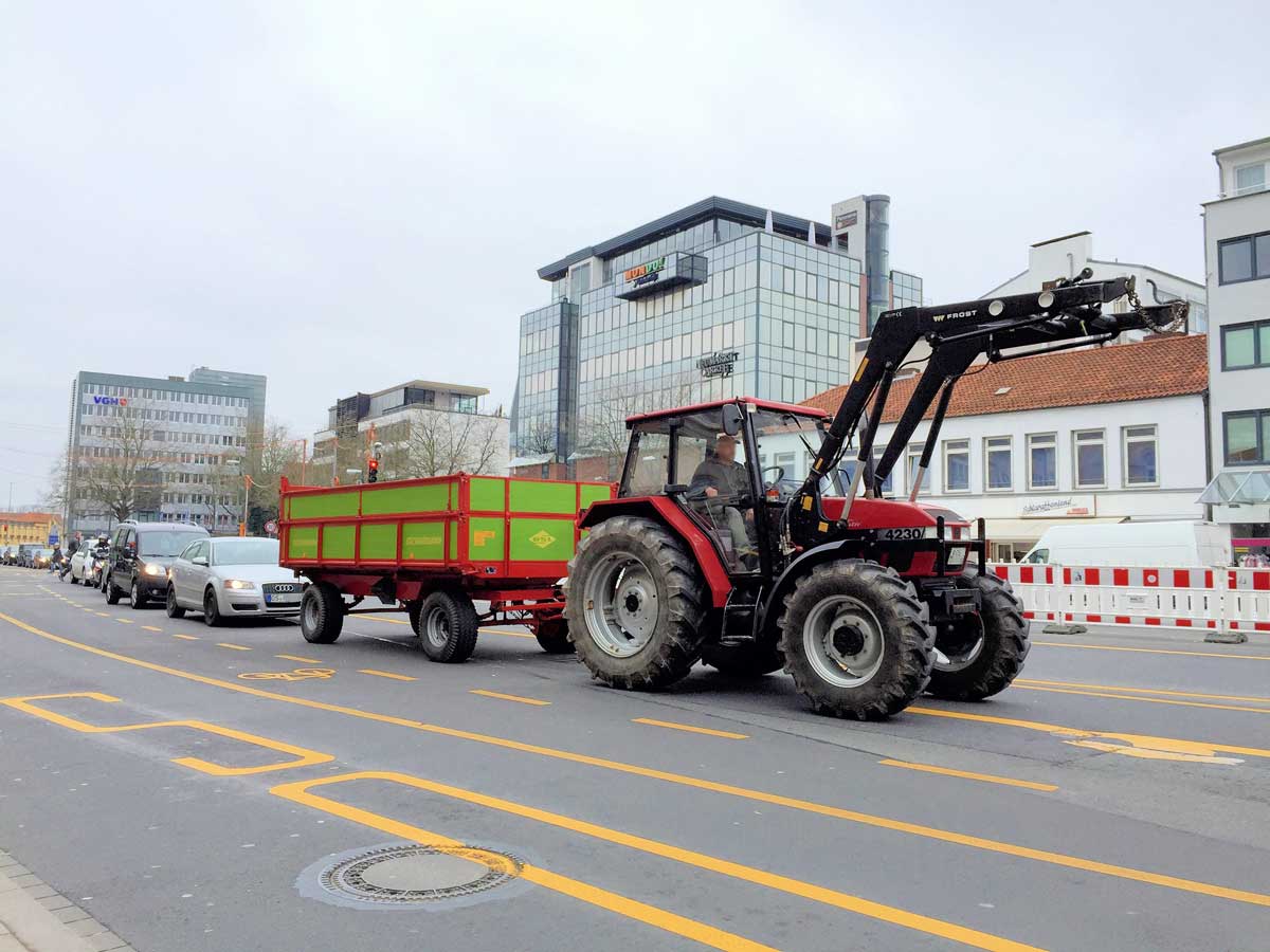 Zusammen mit der Stadtverwaltung, die für die Genehmigung von angemeldeten Demonstrationen zuständig ist, wurde mit dem Anmelder vereinbart, dass die Fahrzeuge der Landwirte auf dem Gelände an der Halle Gartlage abgestellt werden sollen. Von dort sollen die protestierenden Bauern die etwa 15 – 20 Minuten Wegstrecke zum Rathaus und wieder zurück zu Fuß bewältigen.