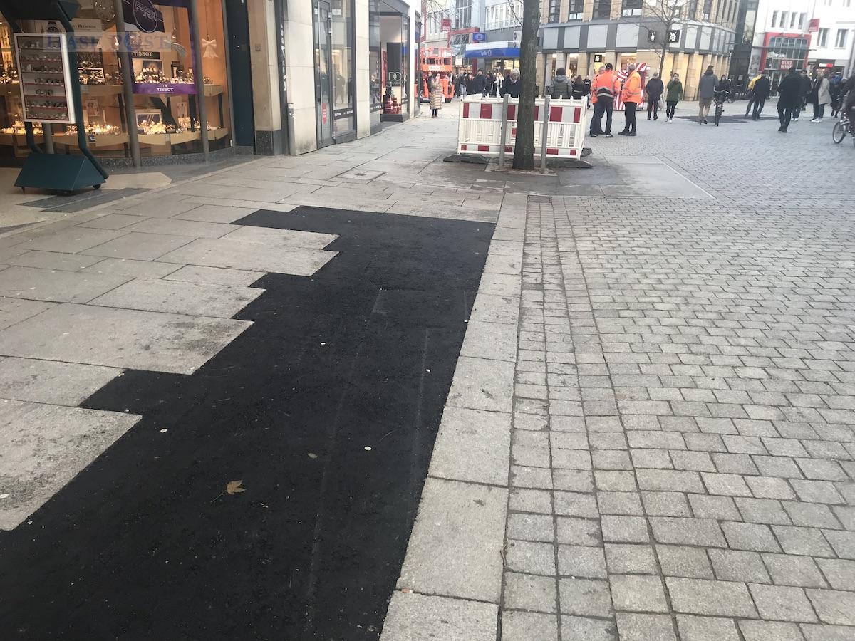 Schwarze Flicken sind Zeichen der monatelangen Baustelle in der Großen Straße. / Foto: Burrichter