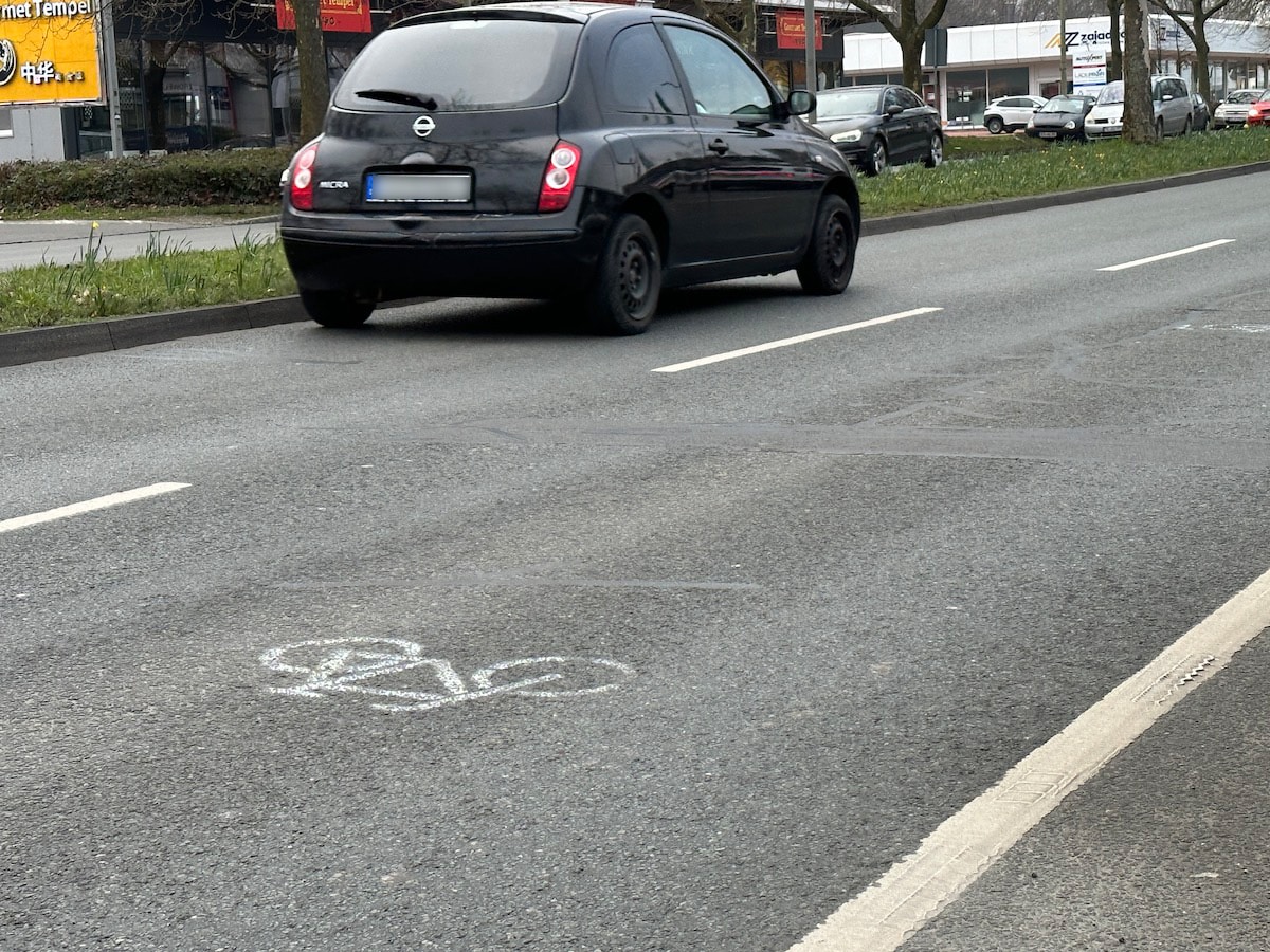 Die Sperrung wurde von den Beamten zurückgebaut. Wenn man vor dem Autohaus Weller genau hinschaut, sind die falsch gesprühten Fahrrad-Piktogramme noch auf dem Asphalt zu erkennen.