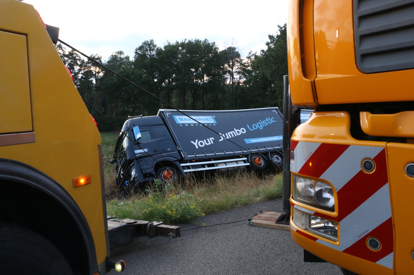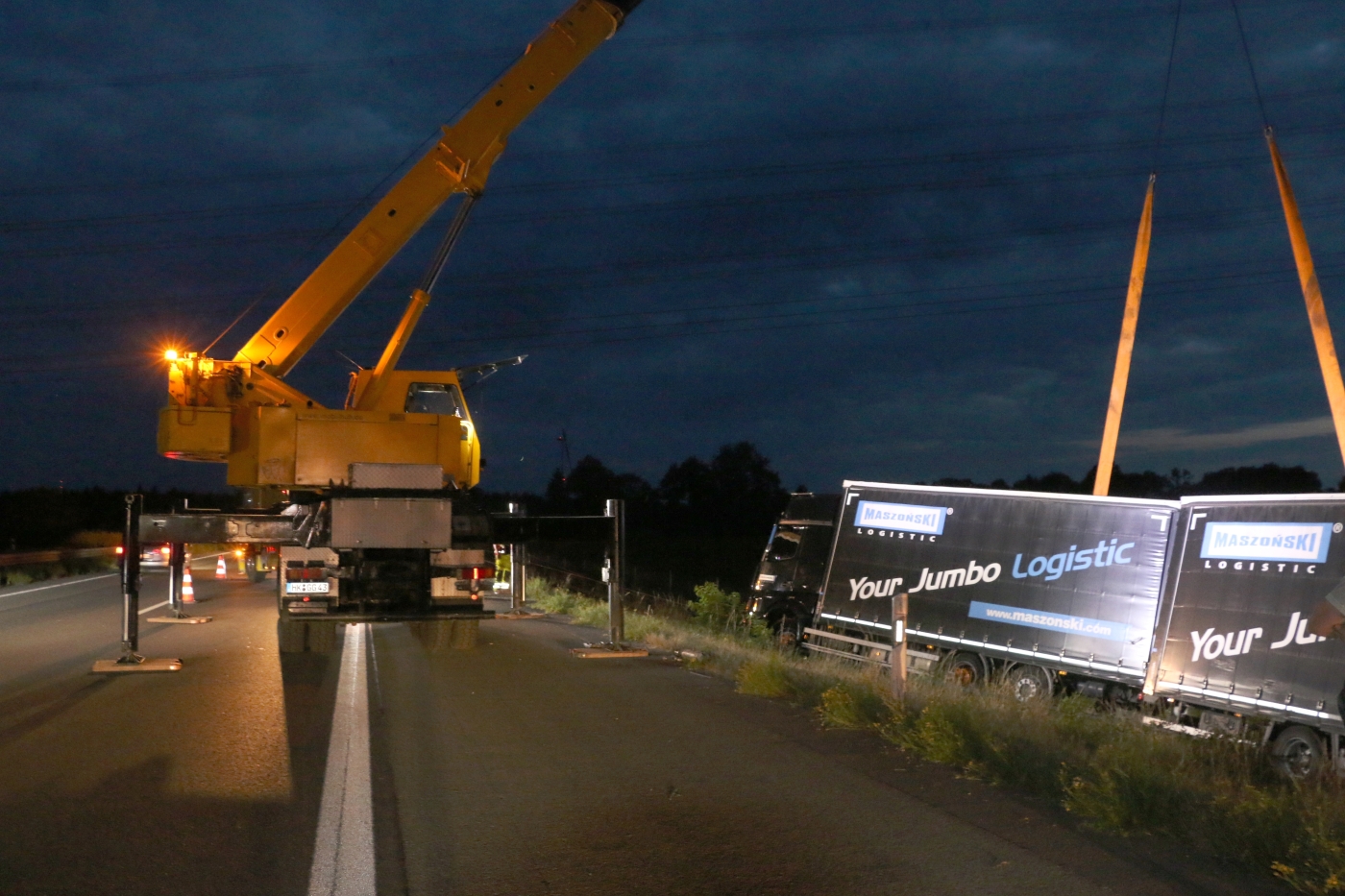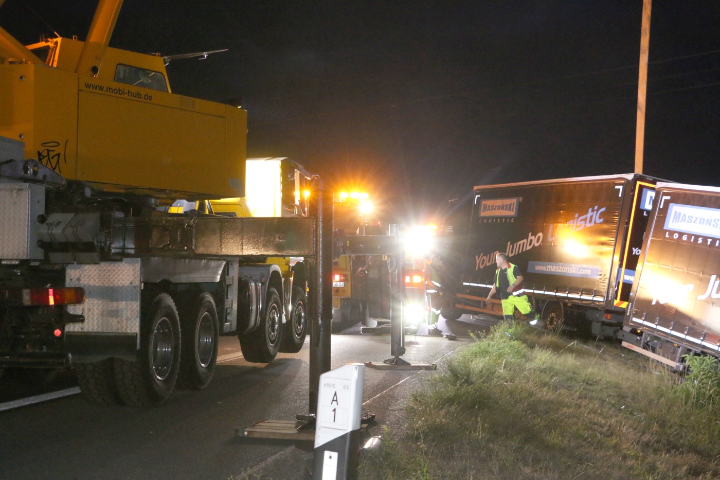 Nachdem am Mittag des 06.08.2018 ein Lastwagen von der Fahrbahn der Autobahn A1 abkam, führten Spezialisten ab dem Abend die Bergung durch.