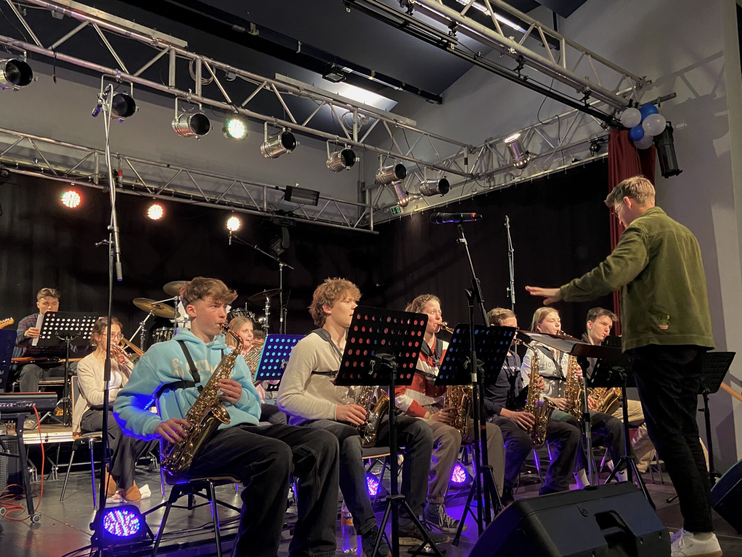 Die Big Band der Ursulaschule (Einige fehlen wegen Klassenfahrten) unter Leitung von Musiklehrer Christopher Lager (rechts) probt fleißig für das gemeinsame Konzert mit der Big Band der Bundeswehr im Hyde Park am 15. Mai. / Foto: Hannah Meiners
