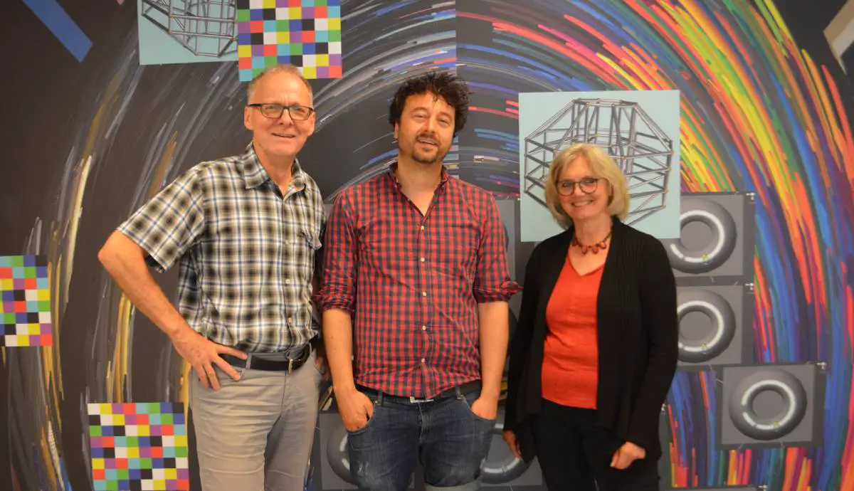 Die Kuratoren Dr. Michael Kröger (links) und Elisabeth Lumme (rechts) stellen mit Künstler Tim Cierpiszewski (mitte) die Ausstellung "LIKE A HOUSE" vor.