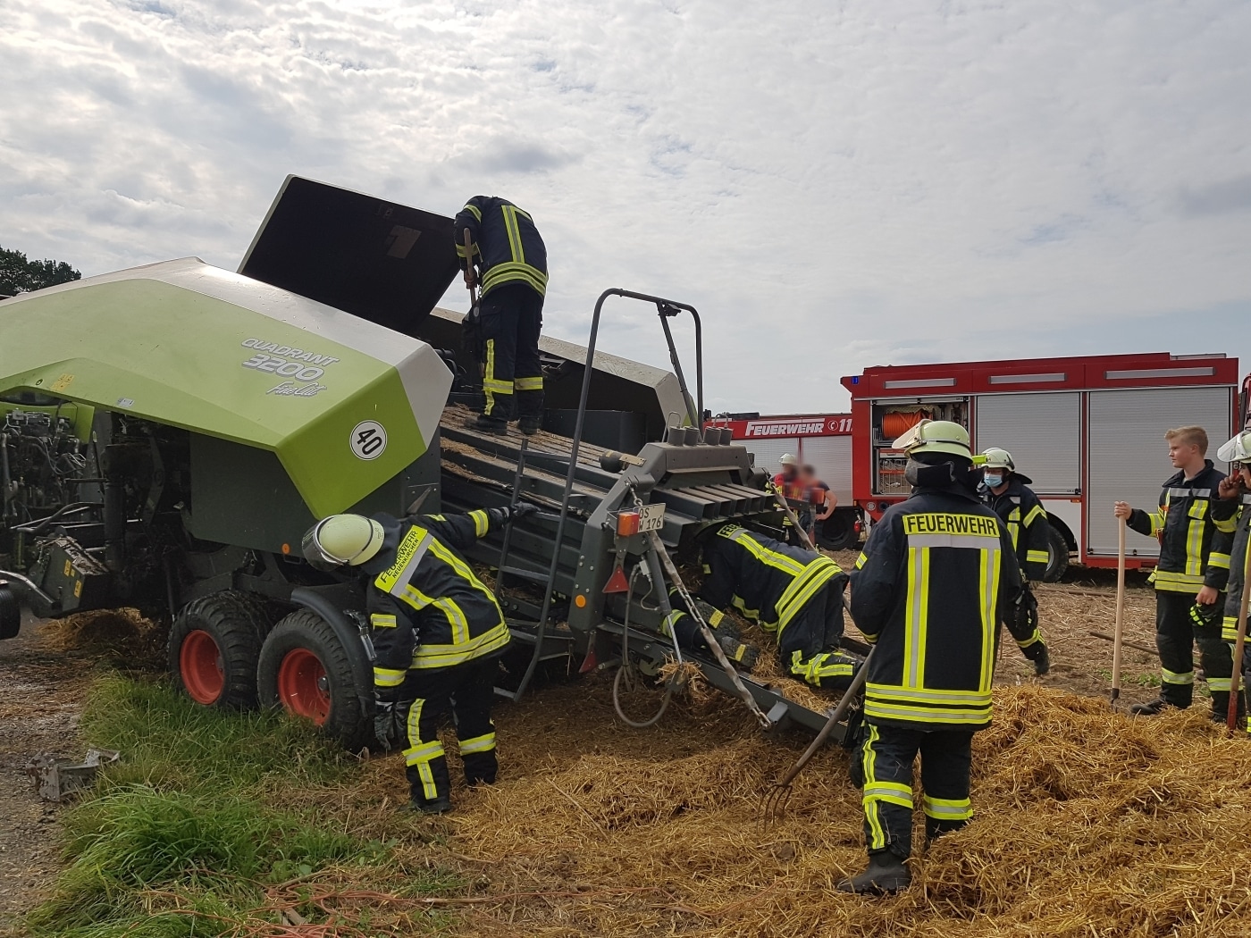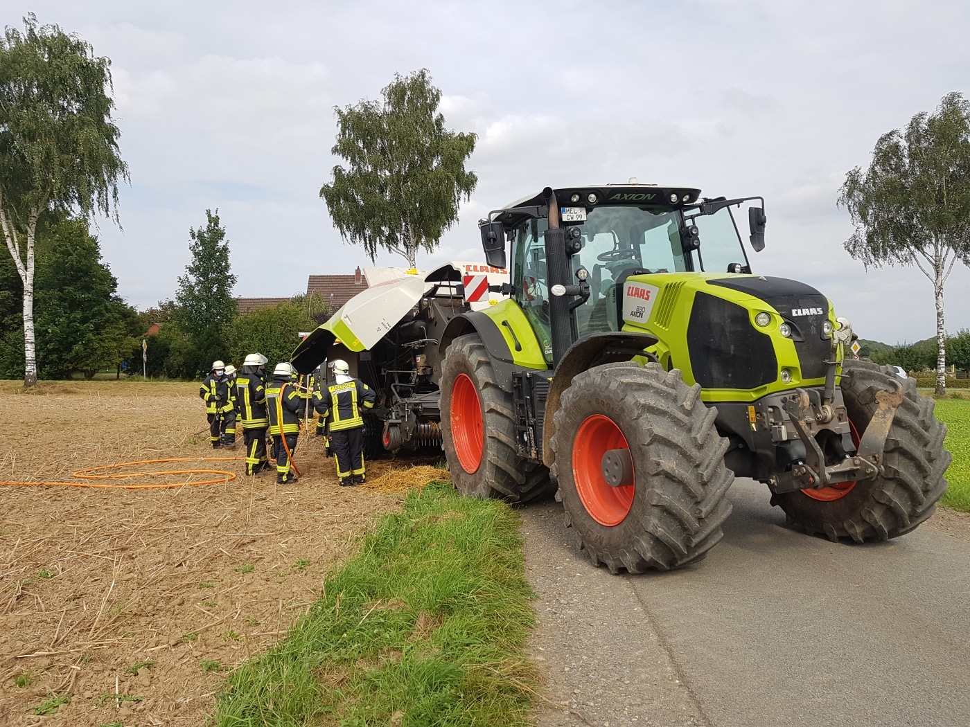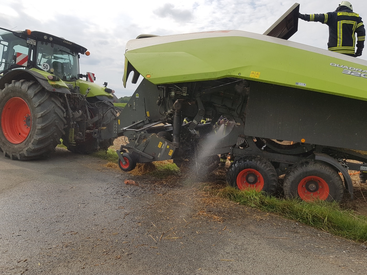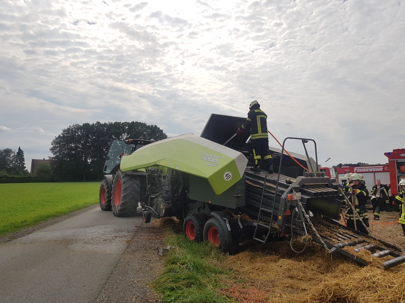 Die circa 40 Brandbekämpfer löschten Stroh und heiße Maschinenteile ab. Um an alle Glutnester zu kommen, wurde das Stroh aus der Maschine geholt und alle Bereiche mit einer Wärmebildkamera inspiziert. Nach rund einer halben Stunde konnten die Maßnahmen beendet werden.