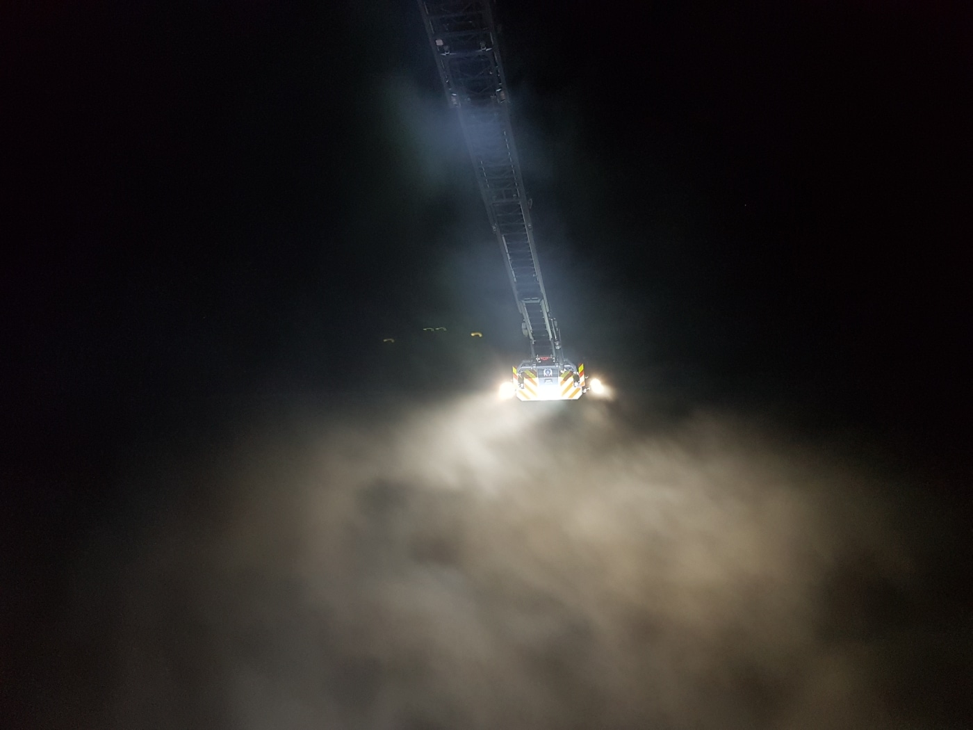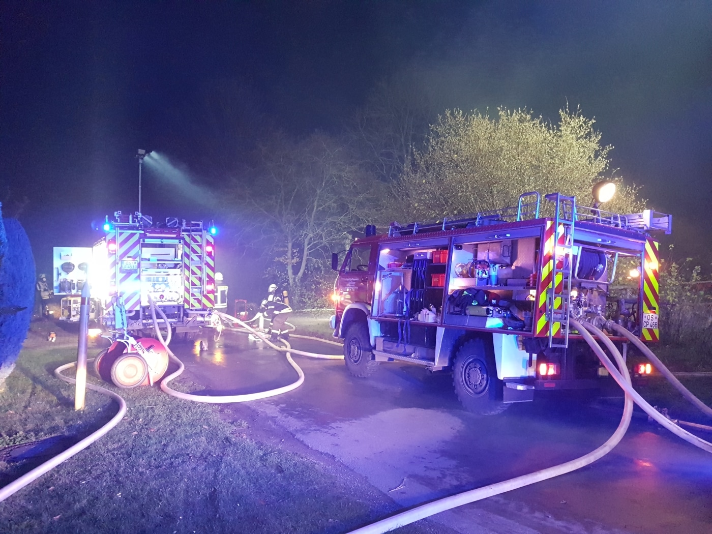 Unverzüglich begannen sie das Feuer zu bekämpfen und bauten parallel zwei sogenannte „Riegelstellungen“ auf. Diese haben das oberste Ziel, die Ausbreitung des Brandes in eine bestimmte Richtung bzw. auf einen bestimmten Bereich zu verhindern, bis das eigentliche Schadfeuer unter Kontrolle gebracht werden kann. So schützte die Feuerwehr ein Gebäude auf dem Nachbargrundstück sowie einen alten Kotten auf hinter dem Lager.