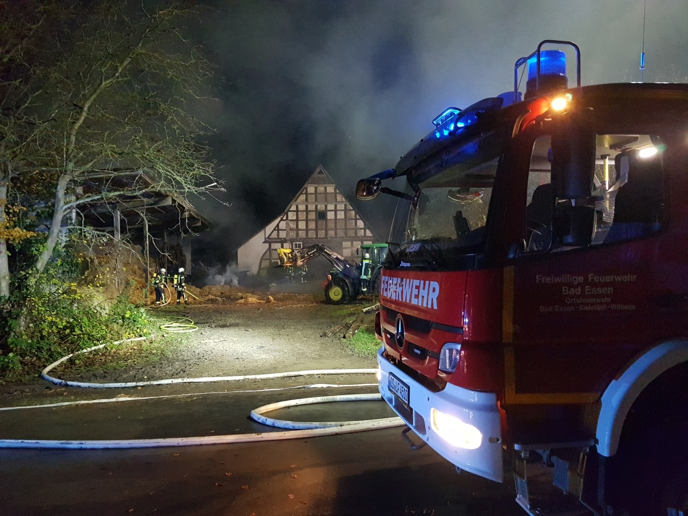 Um 16:51 Uhr wurden Polizei und Feuerwehr zum Brand alarmiert. Die Feuerwehr Bad Essen rückte mit der Ortsfeuerwehr Bad Essen-Eielstädt-Wittlage und der Alarmeinheit Harpenfeld / Lockhausen an, sodass drei Ortsfeuerwehren mit rund 70 Personen zunächst vor Ort waren.