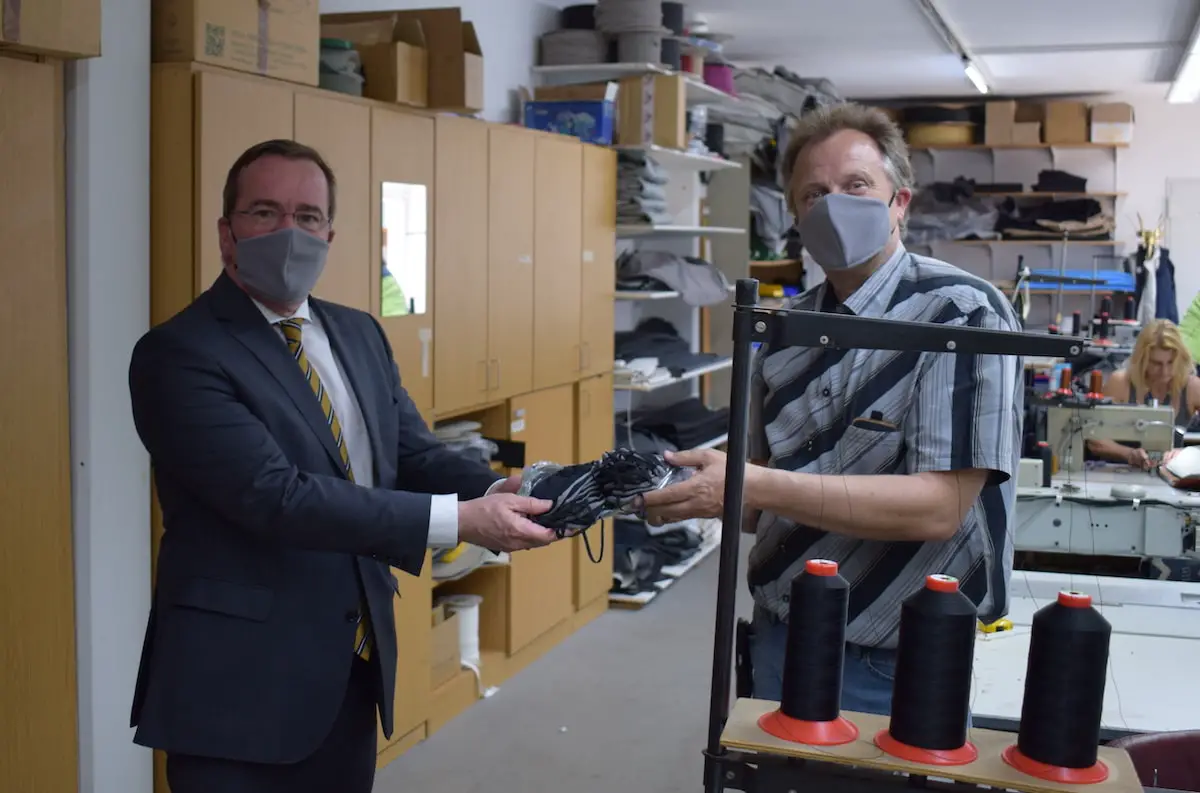 Innenminister Pistorius (links) besichtigt mit Geschäftsführer Jörg Dilge die Maskenproduktion.