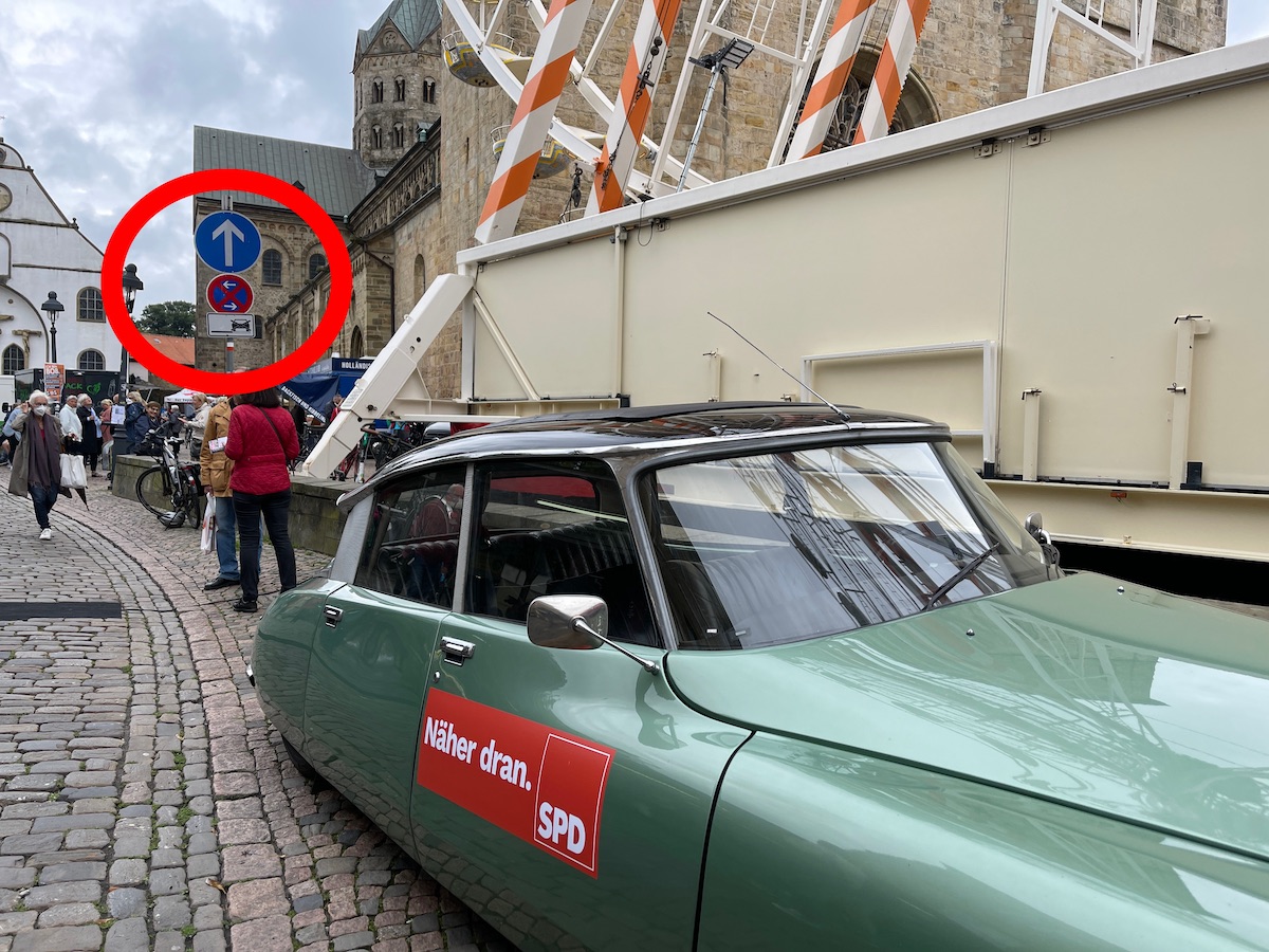 Doch während der BOB noch über theoretisch möglich Parkplätze spricht, die fehlen und die zumindest zeitweise, zum Beispiel für einen Marktbesuch eingerichtet werden könnten (=Konjunktiv), parkt ein prominentes Osnabrücker SPD-Mitglied regelmäßig sein Auto direkt neben dem Wahlkampfstand.
