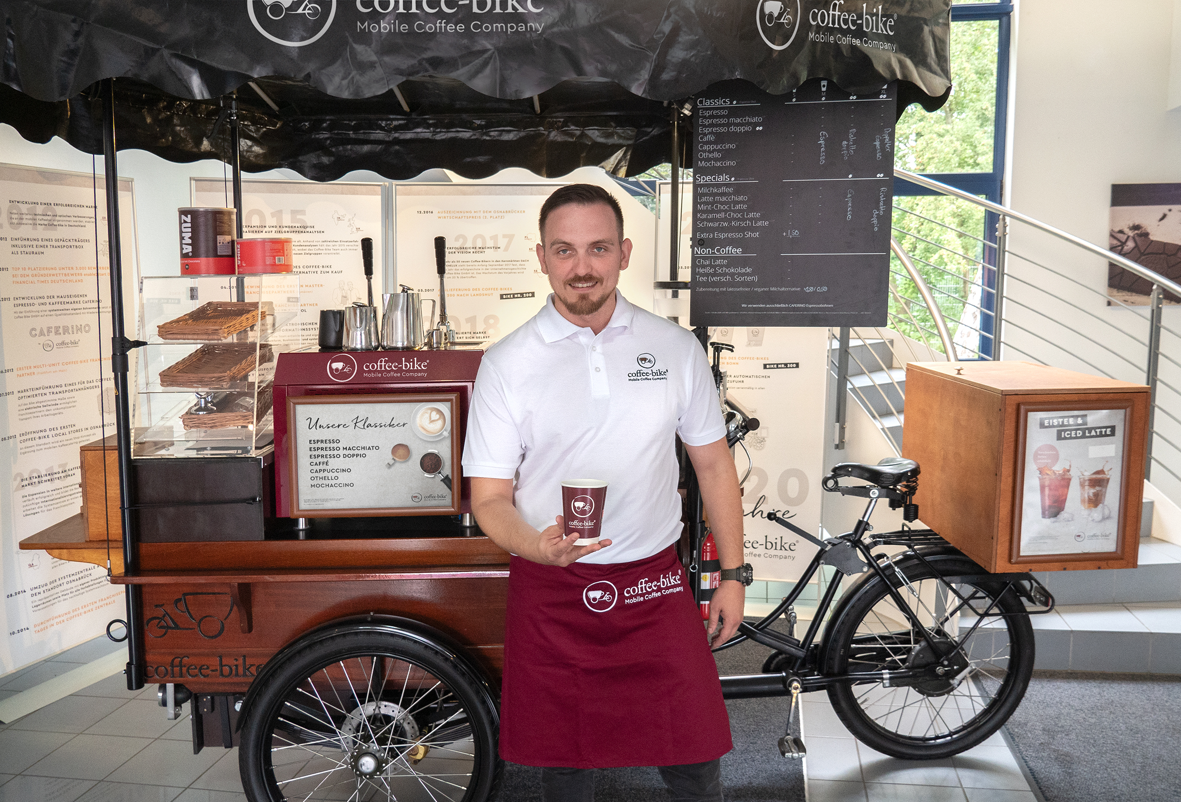 Vor dem Start mit dem Coffee-Bike war Mario als Paketzusteller und nebenberuflich als Kellner tätig. Während einer Jobmesse in Osnabrück entdeckte er die mobile Kaffeebar, die von den Mitarbeitenden der Osnabrücker Coffee-Bike Zentrale betrieben wurde. Nun führt er mit seinem eigenen rollenden Café Kaffeecaterings auf Veranstaltungen durch und freut sich, wenn er für Hochzeiten, Geburtstage oder Firmenfeiern gebucht wird. Außerdem begeistert er seine Kunden mit leckeren Kaffeespezialitäten an seinen festen Verkaufsstandorten in der Großen Straße in Osnabrück und an den Salinen in Bad Rothenfelde. In der Osnabrücker Einkaufsmeile ist er in der Woche immer ab 10 Uhr zu finden. Bei gutem Wetter bereitet er den Coffee to-go am Wochenende in der Kurstadt zu.