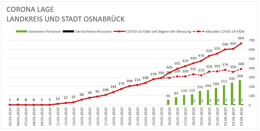 Heute (3. April 2020) treffen 27 Neuinfizierte auf 23 Genesene. Die Anzahl der aktuellen Corona-Infektionen in Stadt und Landkreis Osnabrück steigt demnach wieder an. Eine weitere Person ist an einer COVID-Erkrankung verstorben.