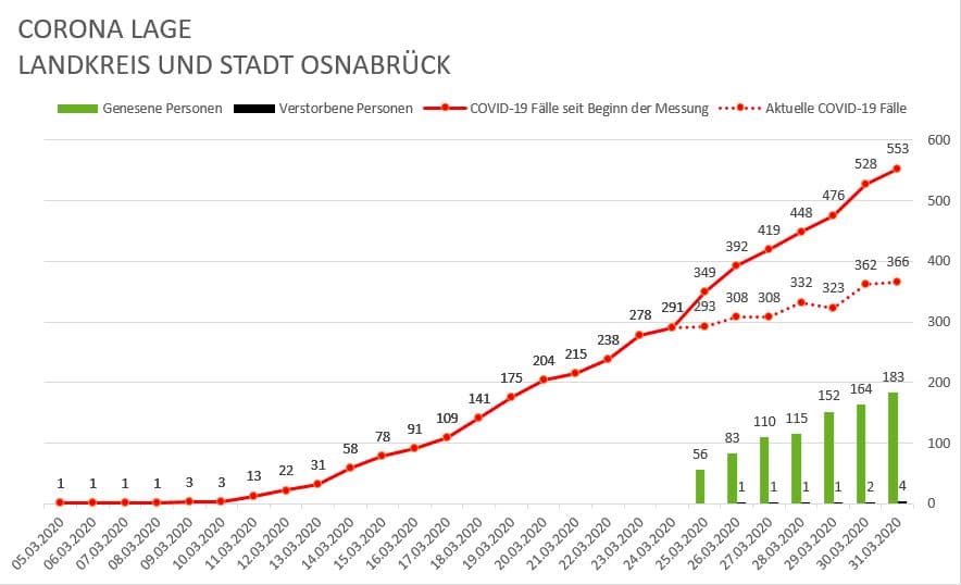 Infektionszahlen, Stand 31. März 2020, 8:30. / Quelle: Stadt und Landkreis Osnabrück.