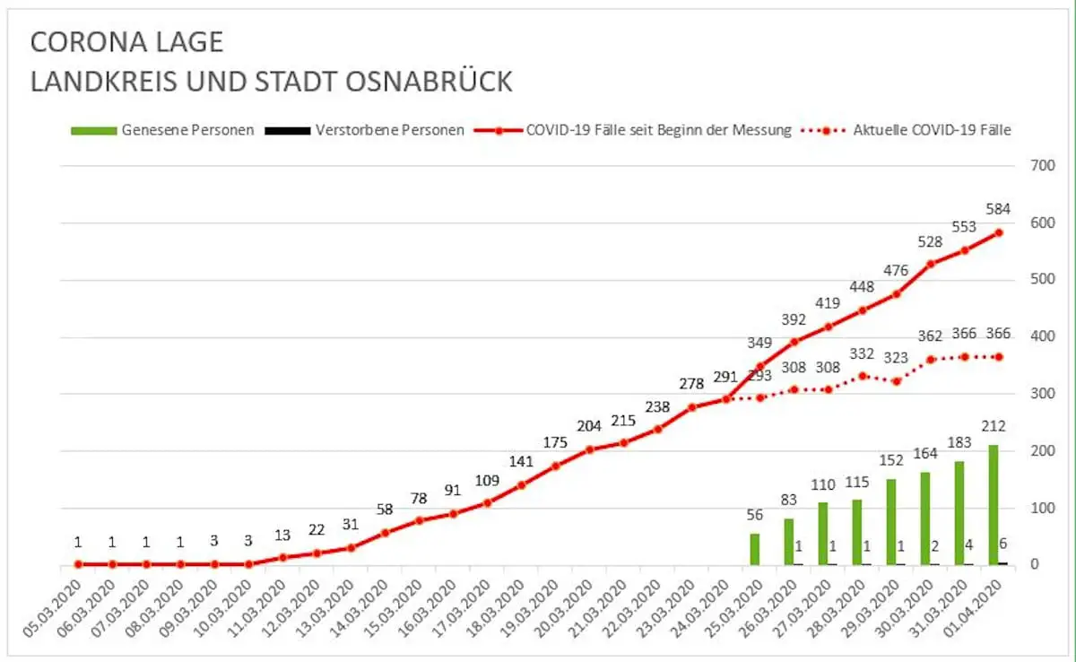 Aus dem Landkreis Osnabrück werden insgesamt 320 bestätigte Fälle gemeldet. Zudem befinden sich 1.205 Personen in Quarantäne.