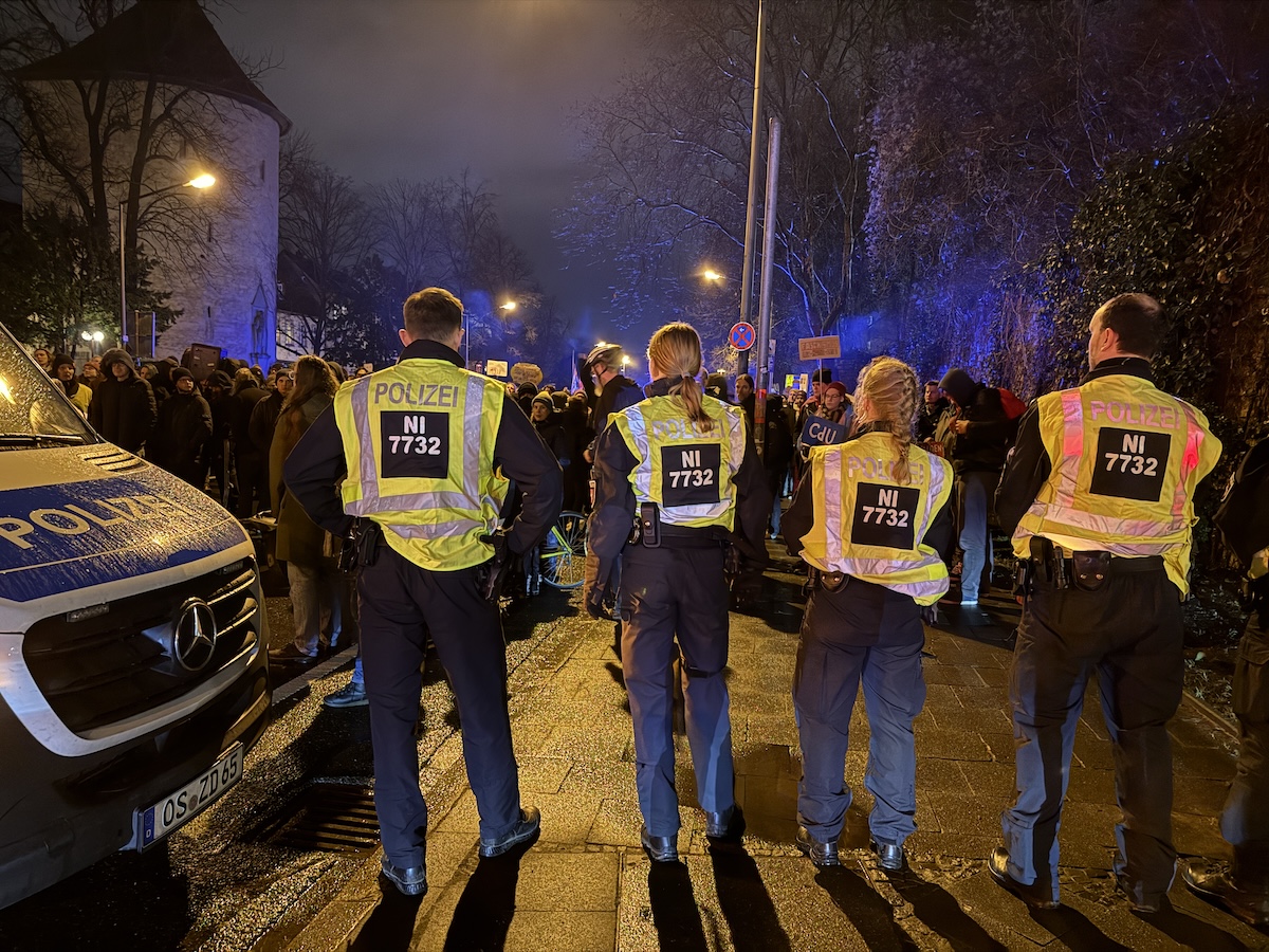 Einen Tag nach der Abstimmung über einen Antrag der Union, dem auch Abgeordnete der AfD zustimmten, demonstrierten mehrere Hundert Teilnehmer, überwiegend aus dem linken und linksextremen Spektrum, vor dem Parteibüro der Osnabrücker CDU am Schloßwall.