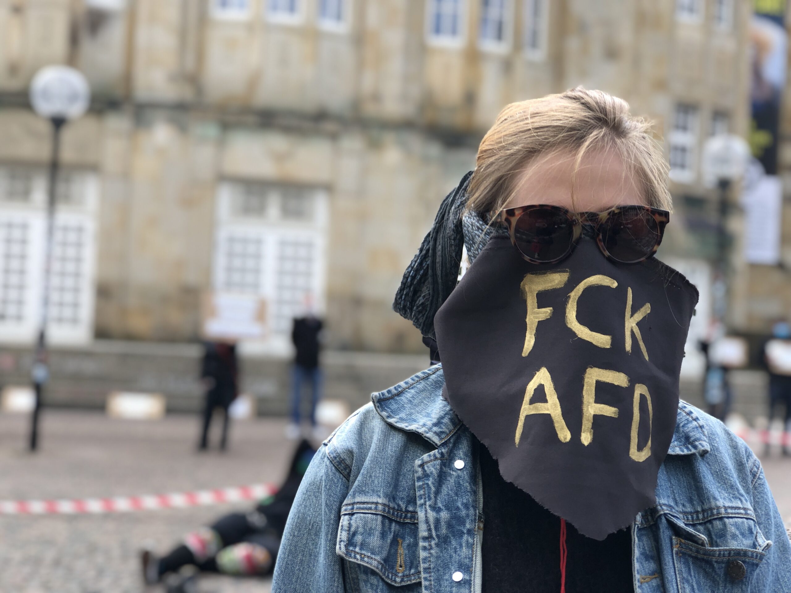 Der AfD-Hintergrund des Anmelders der Demonstration mobilisierte wiederum zahlreiche Gegendemonstranten, die sich lautstark und teils mit Trillerpfeifen vor der nur rund ein halbes Dutzend starken ersten Demonstration am Domhof platzierten und die Einhaltung der Abstandsregeln dabei nicht immer beachteten.