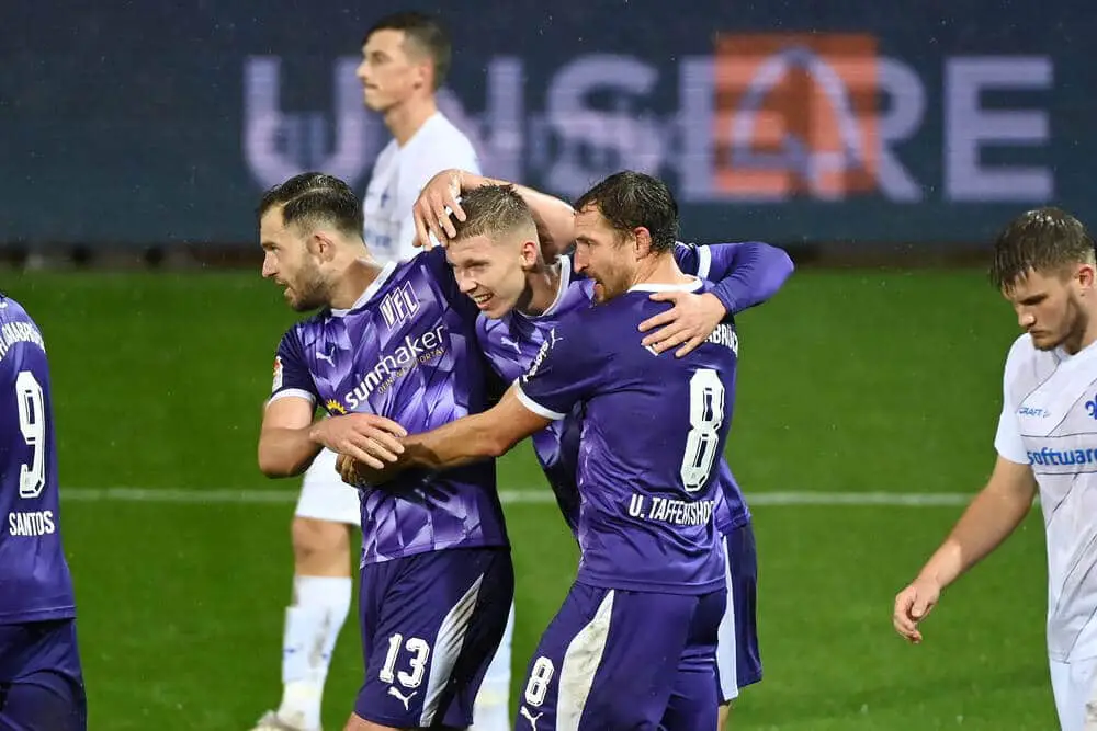 Titelfoto: Luc Ihorst jubelt nach seinem Tor zum 1:1 mit Ken Reichel und Ulrich Taffertshofer, Foto: imago images / Nordphoto