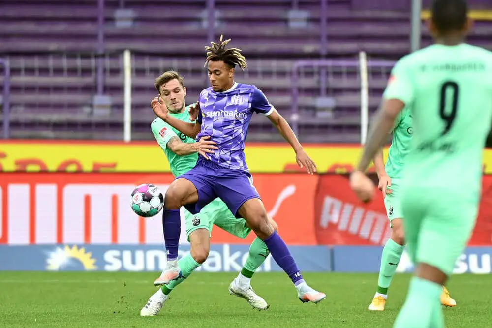 Titelfoto: Nils Röseler (SV Sandhausen) im Zweikampf gegen Etienne Amenyido, Foto: imago images / Nordphoto