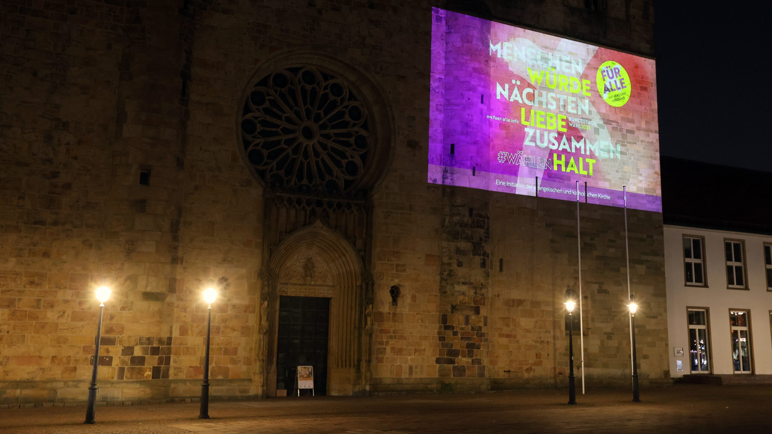 Ein eindrucksvolles Lichtsignal setzt das Bistum Osnabrück am Dom: Mit einer großflächigen Projektion ruft es die Bürgerinnen und Bürger zur Teilnahme an der Bundestagswahl 2025 auf. Jeden Abend bis zum 23. Februar erstrahlen auf dem rechten Turm des Doms die zentralen Begriffe der Kampagne „Für alle. Mit Herz und Verstand“.