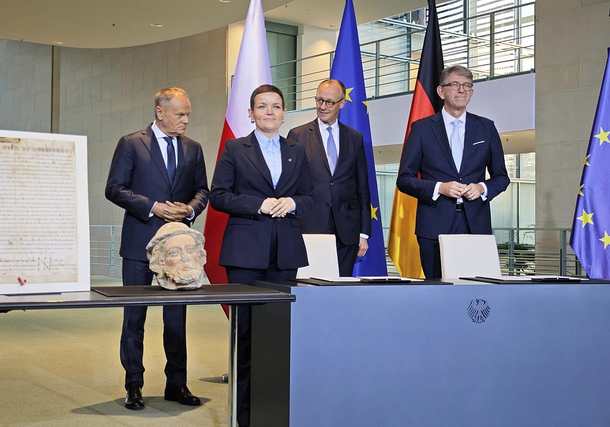 Kulturstaatsminister Wolfram Weimer hat am Montag im Rahmen der deutsch-polnischen Regierungskonsultationen Kulturgüter an seine Amtskollegin Marta Cienkowska zurückgegeben. Dazu gehören nach Angaben der Bundesregierung 73 Pergamenturkunden des Deutschen Ordens aus dem Geheimen Staatsarchiv Preußischer Kulturbesitz sowie der Kopf des Heiligen Jakobus des Älteren.