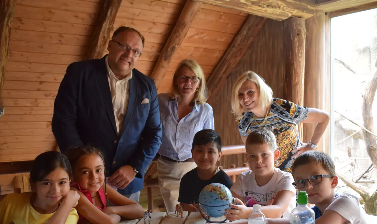 Die gespendeten 10.000 Euro ermöglichten den Aufbau eines „Klassenzimmers“ im Schimpansenhaus und viele Zoobesuche, wie Zoopädagogin Birgit Strunk erklärt. „Wir haben für Kreativarbeiten nach dem 90 minütigen Zoorundgang oder auch für ganze Projekttage einen Bereich geschaffen. Hier können sie basteln, den Lebensraum der Tiere auf einem Globus nachschauen oder auch in Büchern für Referate weitere Informationen nachlesen und notieren. Dafür haben wir vier Gruppenkisten mit extra Utensilien zusammengestellt.“ Die Lernerfolge aus dem Projekt verankern sich langfristig, wie Strunk weiter berichtet: „Wir erkennen frühere Schüler von ‚Deutschlernen im Zoo‘ bei Zooführungen sofort, denn sie wissen fast alles über unsere Zootiere und kennen auch alle richtigen Begriffe. Die Kinder erklären oft ihren Eltern, welches Tier vor ihnen steht.“