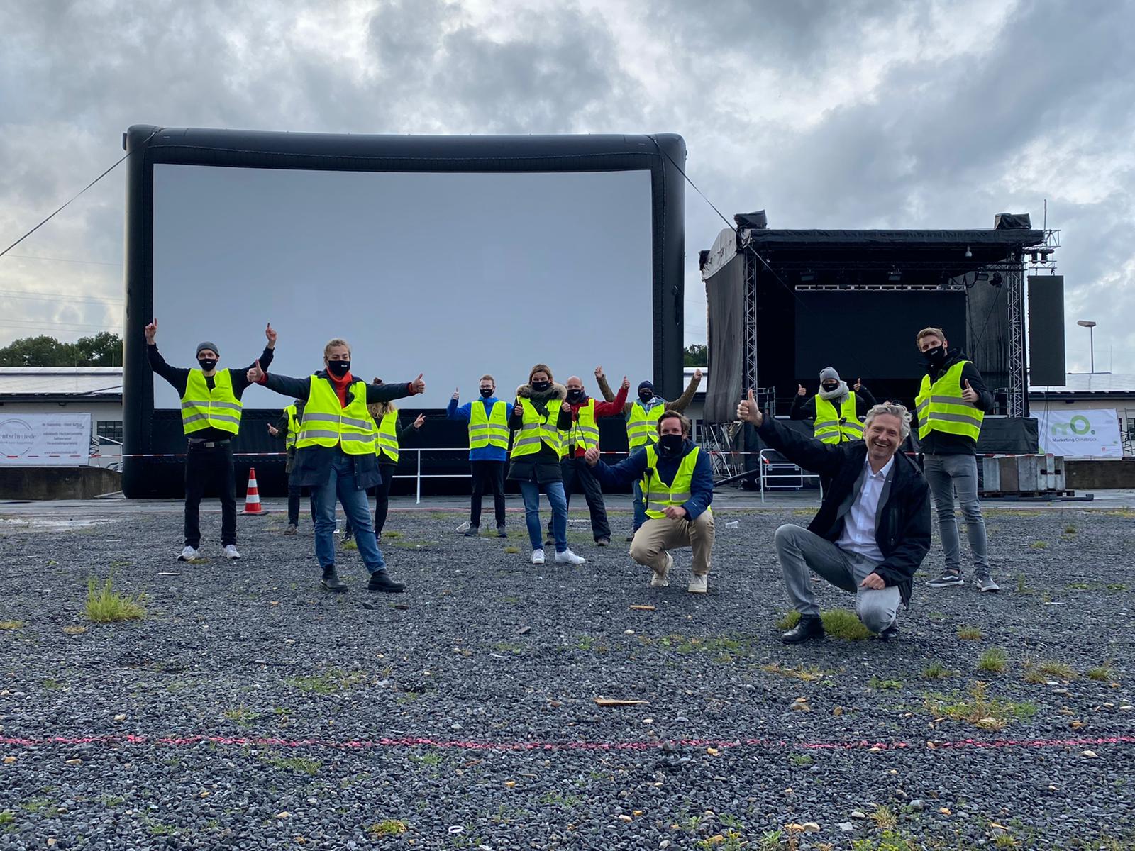 Heute ist es soweit: Das Autokino in Osnabrück an der Halle Gartlage öffnet seine Tore. Die Leinwand steht schon für den ersten Film „Nightlife“ bereit.