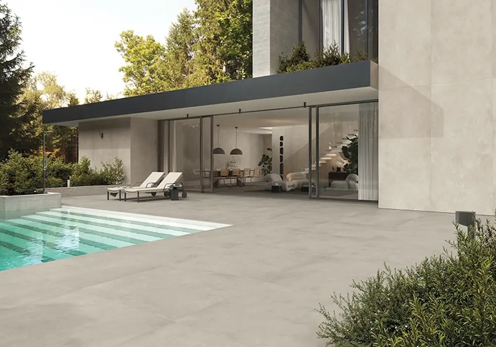 Hier fungieren Feinsteinzeugfliesen als Gestaltungselement, vergleichbar mit Mobiliar oder einer sorgfältig ausgewählten Bepflanzung, das die Atmosphäre gezielt beeinflusst. Rund um die Poolanlage definieren sie die Seele des Ortes: dezent und raffiniert oder lebendig und warm – je nachdem, welche gestalterische Intention verfolgt wird.