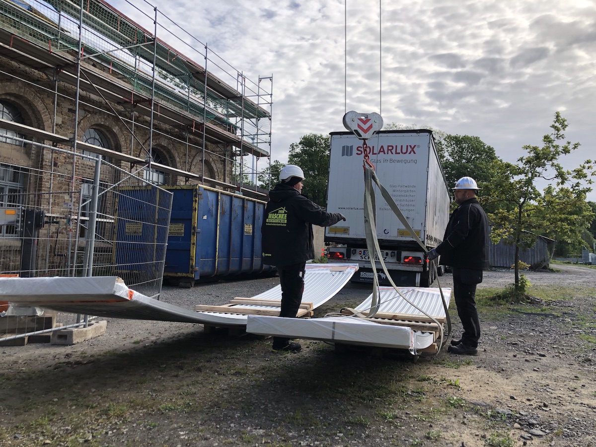 Das Magazingebäude steht inzwischen seit vier Wochen im Gerüst. Bei dem Dach handelt sich um ein gewölbtes, sogenanntes „Tonnendach“ mit einem Tragwerk aus Stahl-T-Trägern. Um die Wärmedämmung zu verbessern, wurde das vorhandene Tragwerk mit einer hölzernen Unterkonstruktion erhöht, anschließend mit einer diffusionsoffenen Unterspannbahn belegt und mit sogenannten Konterlatten befestigt. Nachdem das Ganze statisch zusätzlich mit Stahlbändern gesichert wurde, kann die Dachfläche im nächsten Schritt mit Aluminiumprofilen eingedeckt werden. Diese Aluminiumprofile wurden eigens für das Dach angefertigt, die entsprechende Rundung wurde aufgenommen. Die Materialwahl des Aluminiums war eine Vorgabe des Denkmalschutzes. Die Profile werden heute angeliefert und mit einem Kran zur Montage auf das Dach gehoben.