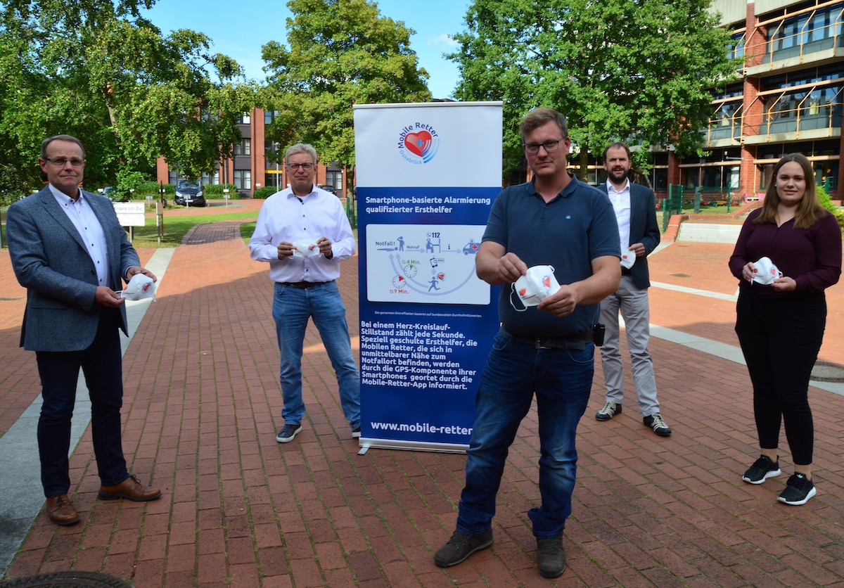 Ansgar Pohlmann (Stiftung Stahlwerk Georgsmarienhütte) Andreas Mennewisch (Ärztlicher Leiter Rettungsdienst Landkreis Osnabrück) Robert Fortmann (Mobiler Retter) Volker Trunt (Vorstand Rettungsleitstelle) und Julia Heyer (Projektleitung) (v.l.n.r.) zeigen die „Mobile Retter“ Corona-Masken. / Foto: Henning Müller-Detert, Landkreis Osnabrück