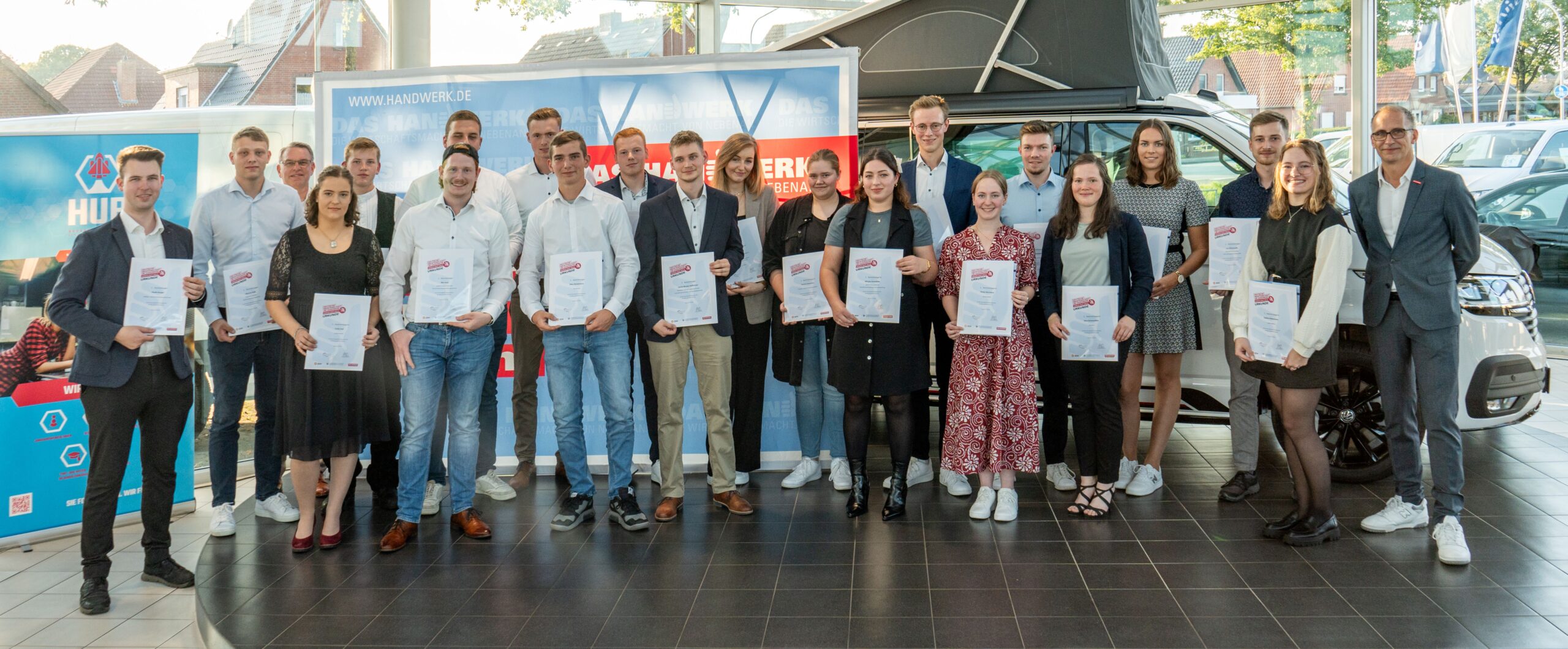 Für herausragende Leistungen in der Ausbildung und in der Gesellenprüfung zeichnete die Handwerkskammer nun 27 junge Gesellinnen und Gesellen aus, die in ihrem Gewerk die beste Prüfung im Kammerbezirk Osnabrück-Emsland-Grafschaft Bentheim abgelegt haben. Während einer Feierstunde in der Grafschafter Autozentrale Heinrich Krüp in Nordhorner ehrten Kammervizepräsident Kai Schaupmann und Hauptgeschäftsführer Sven Ruschhaupt die Talente und betonten die Bedeutung der handwerklichen Ausbildung für die Region.
